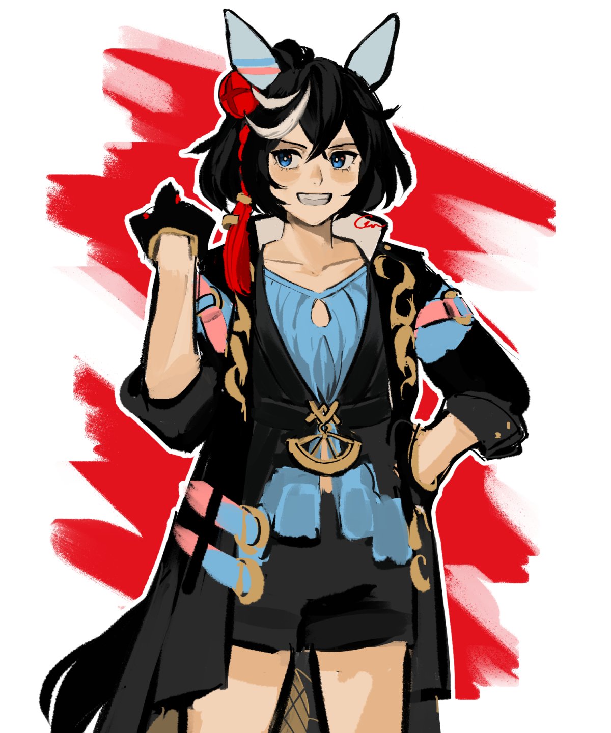 1girl animal_ears black_coat black_gloves black_hair black_shorts black_vest blue_eyes blue_shirt coat cowboy_shot crossed_bangs ear_covers gaman gloves grin hair_ornament hand_on_own_hip hand_up highres horse_ears horse_girl horse_tail katsuragi_ace_(umamusume) long_sleeves looking_to_the_side multicolored_hair open_clothes open_coat ponytail shirt short_hair short_shorts shorts signature smile solo standing streaked_hair tail umamusume vest