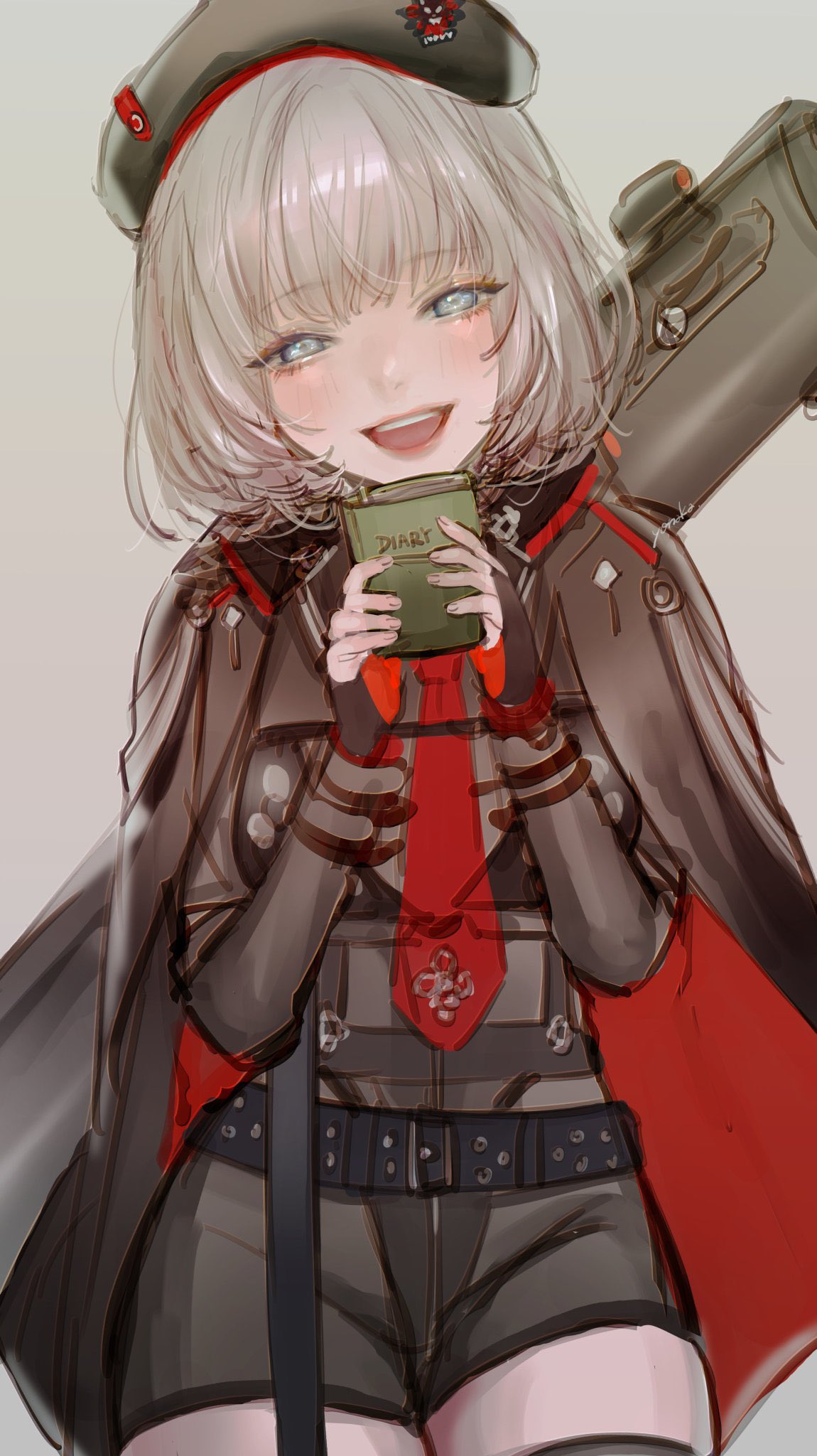 1girl :d belt beret black_cape black_gloves black_hat black_shirt blue_eyes blush cape diary fingerless_gloves gloves goddess_of_victory:_nikke grey_hair hat highres holding looking_at_viewer necktie open_mouth red_cape red_gloves red_necktie rocket_launcher shirt short_hair simple_background smile solo thighhighs two-sided_cape two-sided_fabric two-tone_gloves vesti_(nikke) weapon weapon_on_back yonaka_(my0nk)