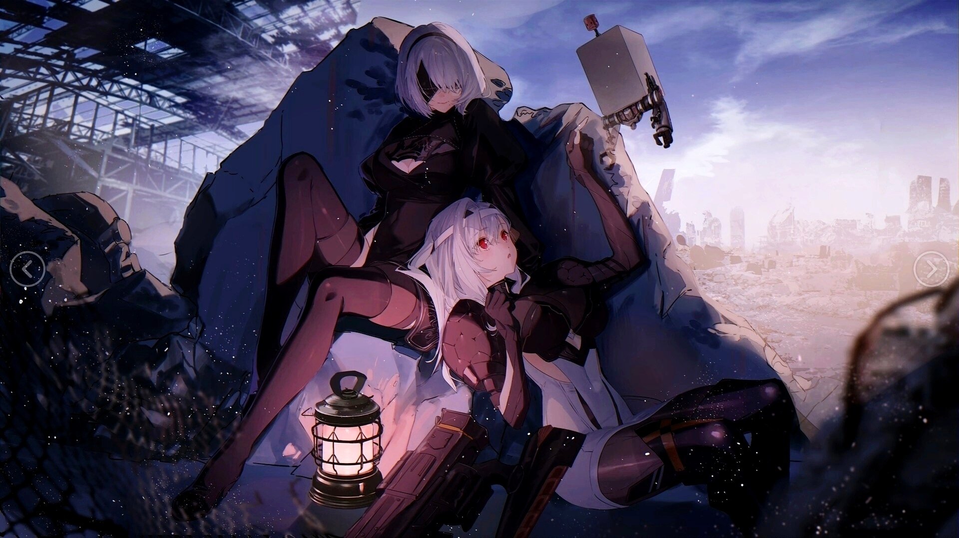 2b_(nier:automata) 2girls armor black_dress black_gloves black_hairband blindfold boots breasts bsq cleavage clothing_cutout covered_eyes crossover debris dress gloves goddess_of_victory:_nikke grey_hair hairband highres juliet_sleeves lantern large_breasts long_hair long_sleeves medium_breasts modernia_(nikke) multiple_girls nier:automata nier_(series) open_mouth pod_(nier:automata) puffy_sleeves red_eyes see-through_cleavage see-through_clothes short_hair shoulder_armor thighhighs thighhighs_under_boots white_hair