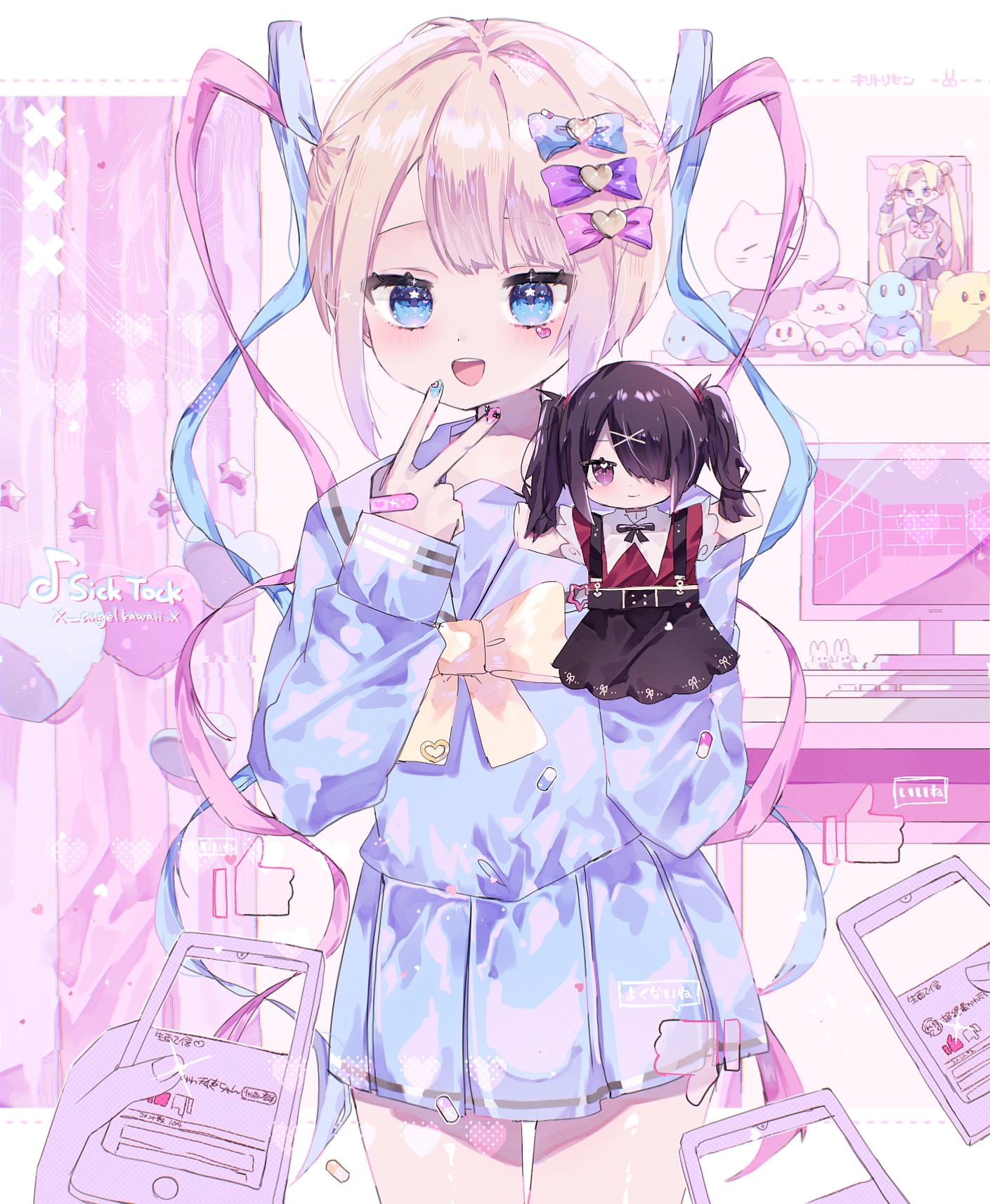 :d ame-chan_(needy_girl_overdose) bishoujo_senshi_sailor_moon black_hair black_ribbon black_skirt blonde_hair blue_bow blue_eyes blue_hair blue_nails blue_shirt blue_skirt blush bow character_doll chouzetsusaikawa_tenshi-chan collar collared_shirt cowboy_shot curtains doll figure hair_bow hair_ornament hair_over_one_eye hair_tie hairclip hand_puppet hands_up heart heart_hair_ornament highres hiro_0607 holding holding_phone indoors like_and_retweet long_hair long_sleeves looking_at_viewer monitor multicolored_hair multicolored_nails neck_ribbon needy_girl_overdose open_mouth phone pill pink_background pink_bow pink_hair pink_nails pleated_skirt puppet purple_bow quad_tails red_shirt ribbon sailor_collar school_uniform serafuku shirt shirt_tucked_in skirt smile standing stuffed_animal stuffed_cat stuffed_toy suspender_skirt suspenders table tiktok_logo tsukino_usagi twintails v very_long_hair white_collar x_hair_ornament yellow_bow
