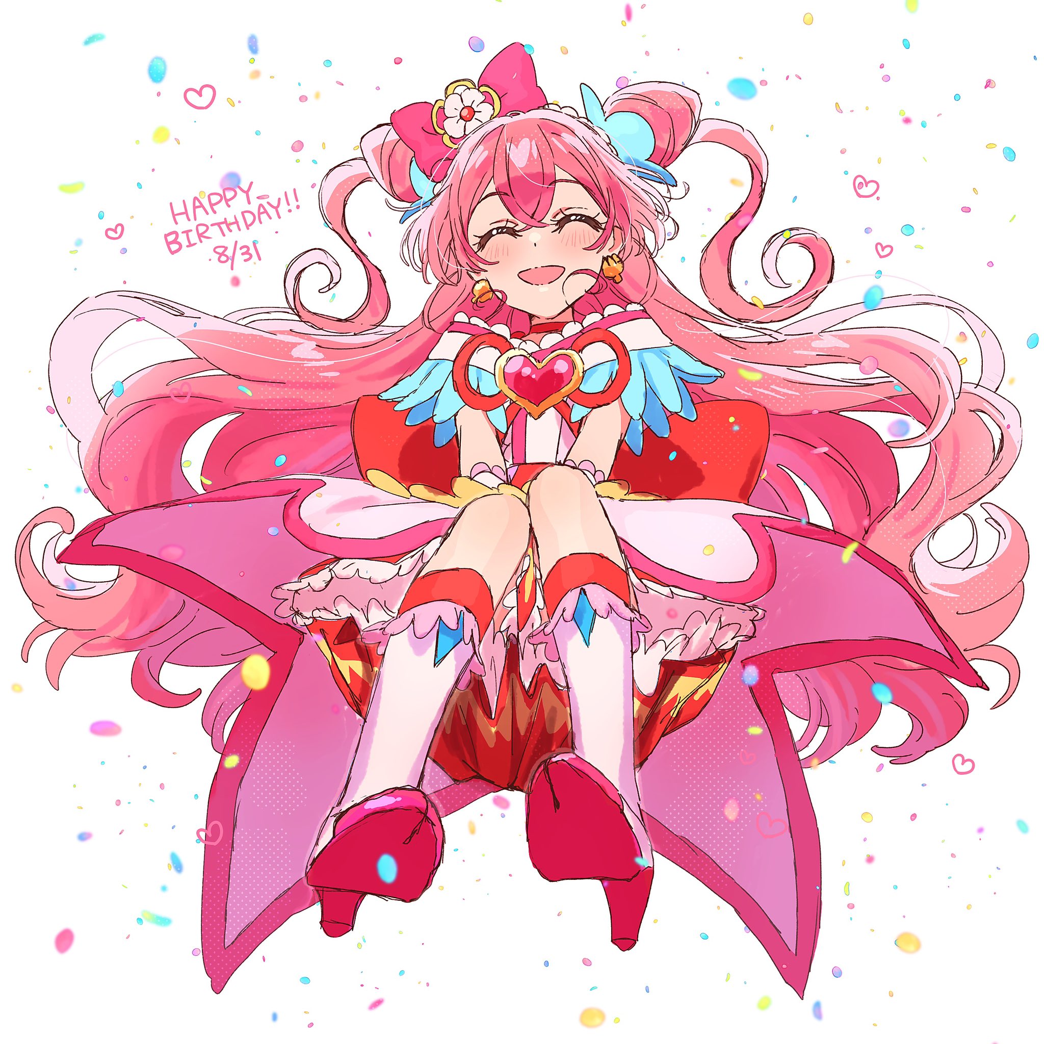 1girl back_bow bow brooch closed_eyes cone_hair_bun cure_precious delicious_party_precure earrings hair_bun happy_birthday heart heart_brooch highres jewelry long_hair magical_girl nagomi_yui pink_hair precure red_bow smile solo two_side_up very_long_hair white_footwear yufu_kyouko