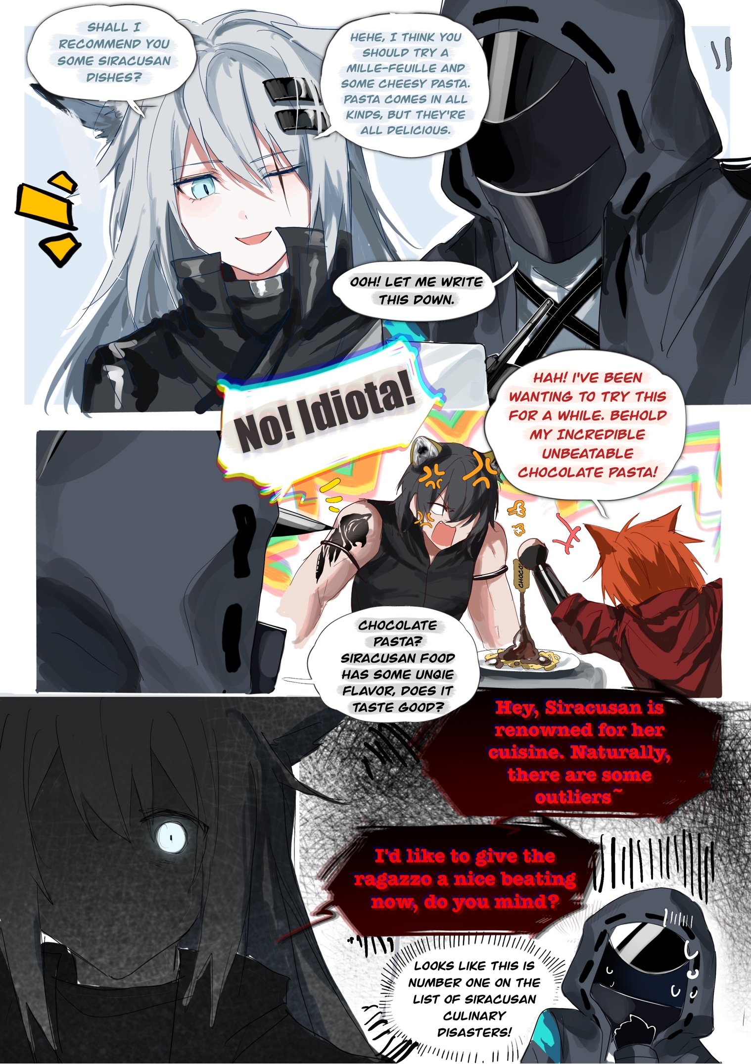 1girl animal_ears arknights bare_shoulders black_hair black_jacket broca_(arknights) chiave_(arknights) chocolate crimes_against_food doctor_(arknights) english_text food hair_between_eyes hair_ornament highres impending_doom jacket lappland_(arknights) long_hair one_eye_closed open_mouth orange_hair pasta scar scar_across_eye scar_on_face simple_background speech_bubble sweatdrop white_hair zuo_daoxing