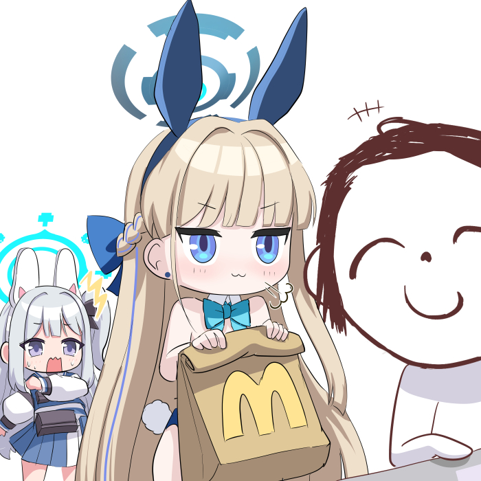 1boy 2girls :3 animal_ears bag bare_shoulders blue_archive blue_bow blue_bowtie blue_eyes blue_leotard bow bowtie braid bulletproof_vest collarbone commentary_request detached_collar doodle_sensei_(blue_archive) earpiece earrings fake_animal_ears fake_tail grey_hair hair_between_eyes hair_bow hair_ribbon hairband half_up_braid halo holding holding_bag jewelry leotard light_brown_hair long_hair long_sleeves looking_at_another mcdonald's miyako_(blue_archive) multicolored_hair multiple_girls nervous_sweating official_alternate_costume official_alternate_hairstyle one_side_up paper_bag playboy_bunny pleated_skirt purple_eyes rabbit_ears rabbit_tail ribbon school_uniform sensei_(blue_archive) serafuku shooka sidelocks simple_background skirt smile smug strapless strapless_leotard streaked_hair sweat tail toki_(blue_archive) toki_(bunny)_(blue_archive) two-tone_hair white_background