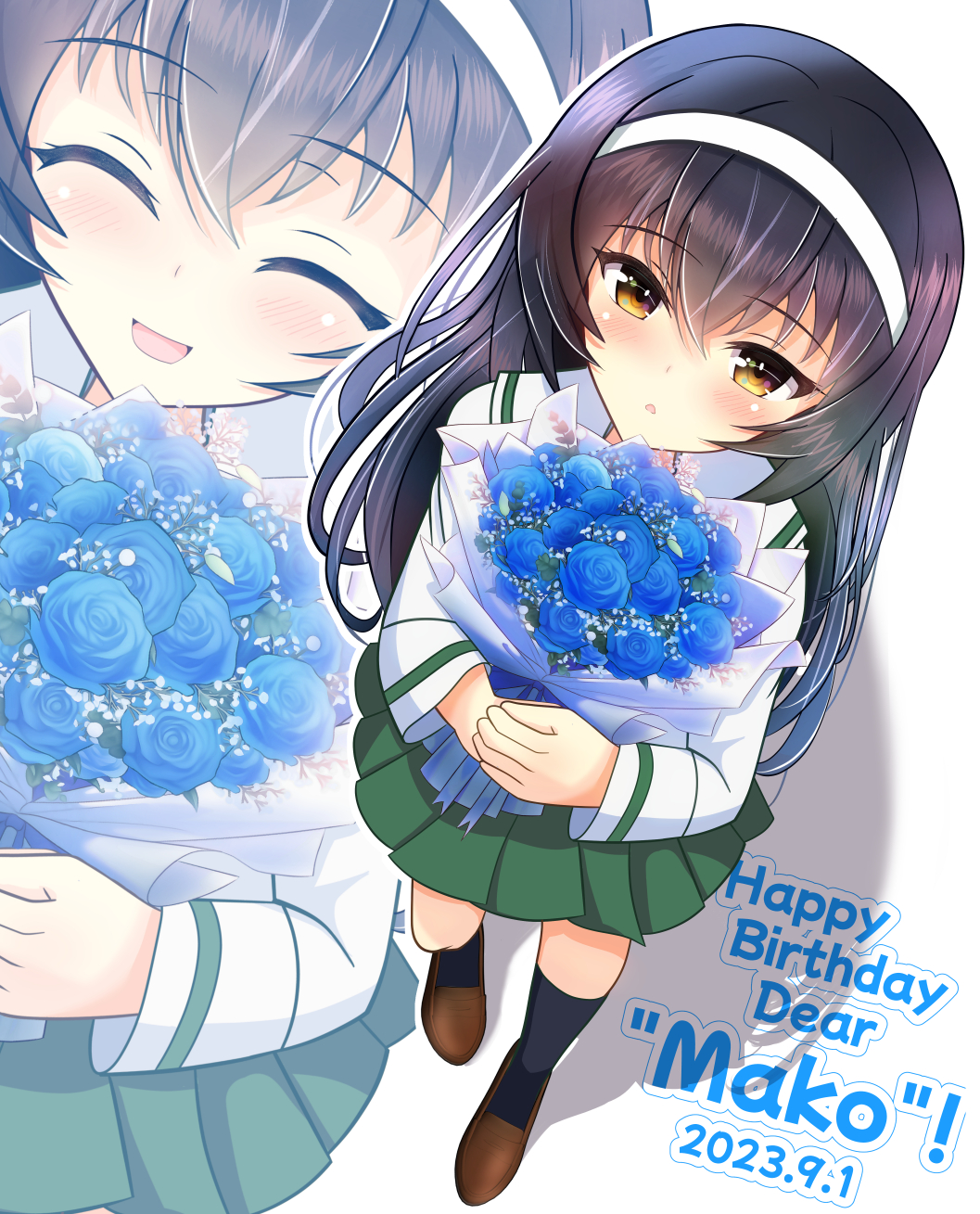 1girl birthday black_hair blush bouquet flower girls_und_panzer gratin_(kumaisao) hairband happy_birthday highres long_hair looking_at_viewer ooarai_school_uniform open_mouth reizei_mako school_uniform solo yellow_eyes