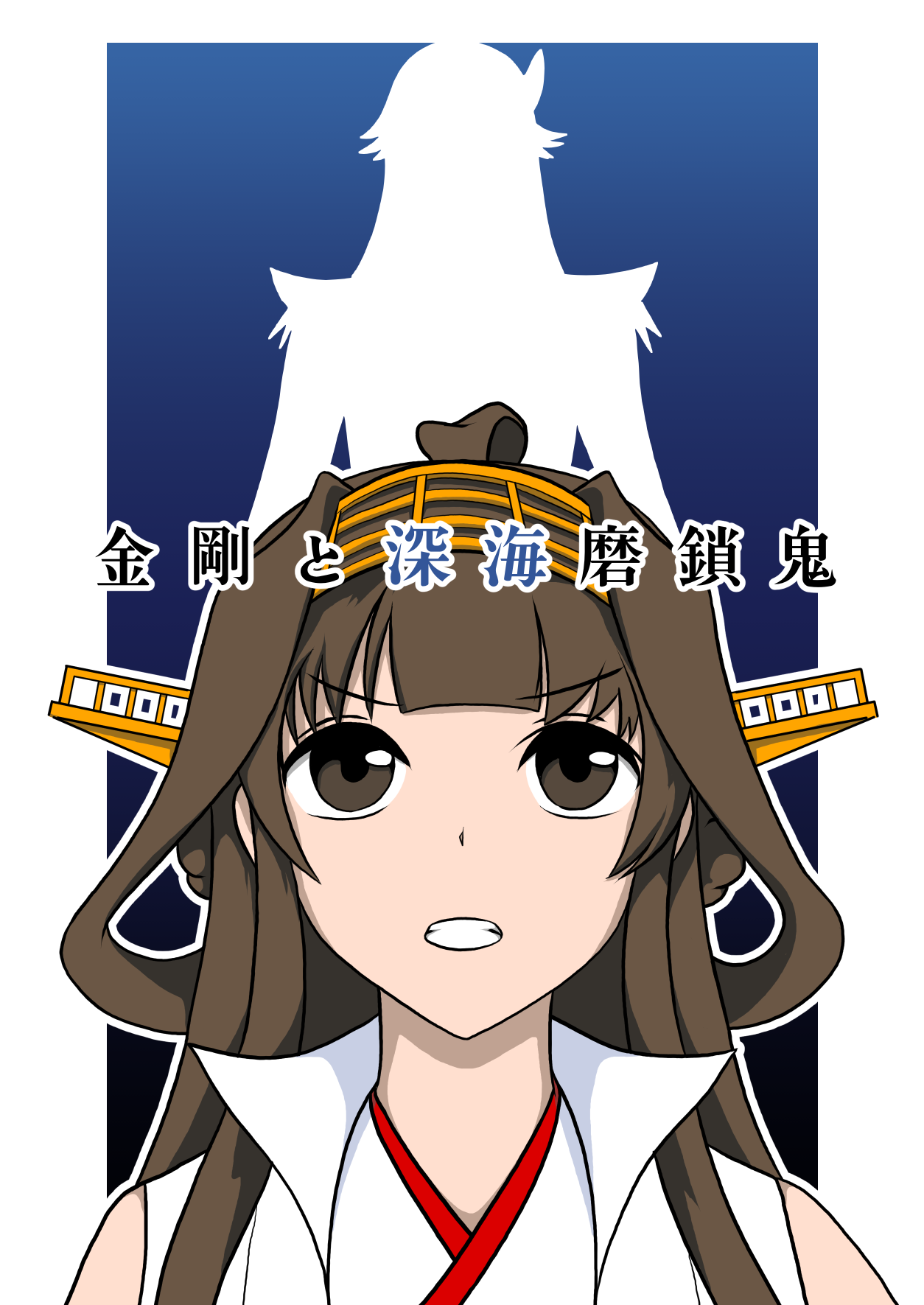 1girl 1other ahoge brown_eyes brown_hair comiket_102 commentary_request cover double_bun hair_bun hairband highres kantai_collection kongou_(kancolle) kongou_kai_ni_(kancolle) long_hair popped_collar silhouette translation_request upper_body yagitch