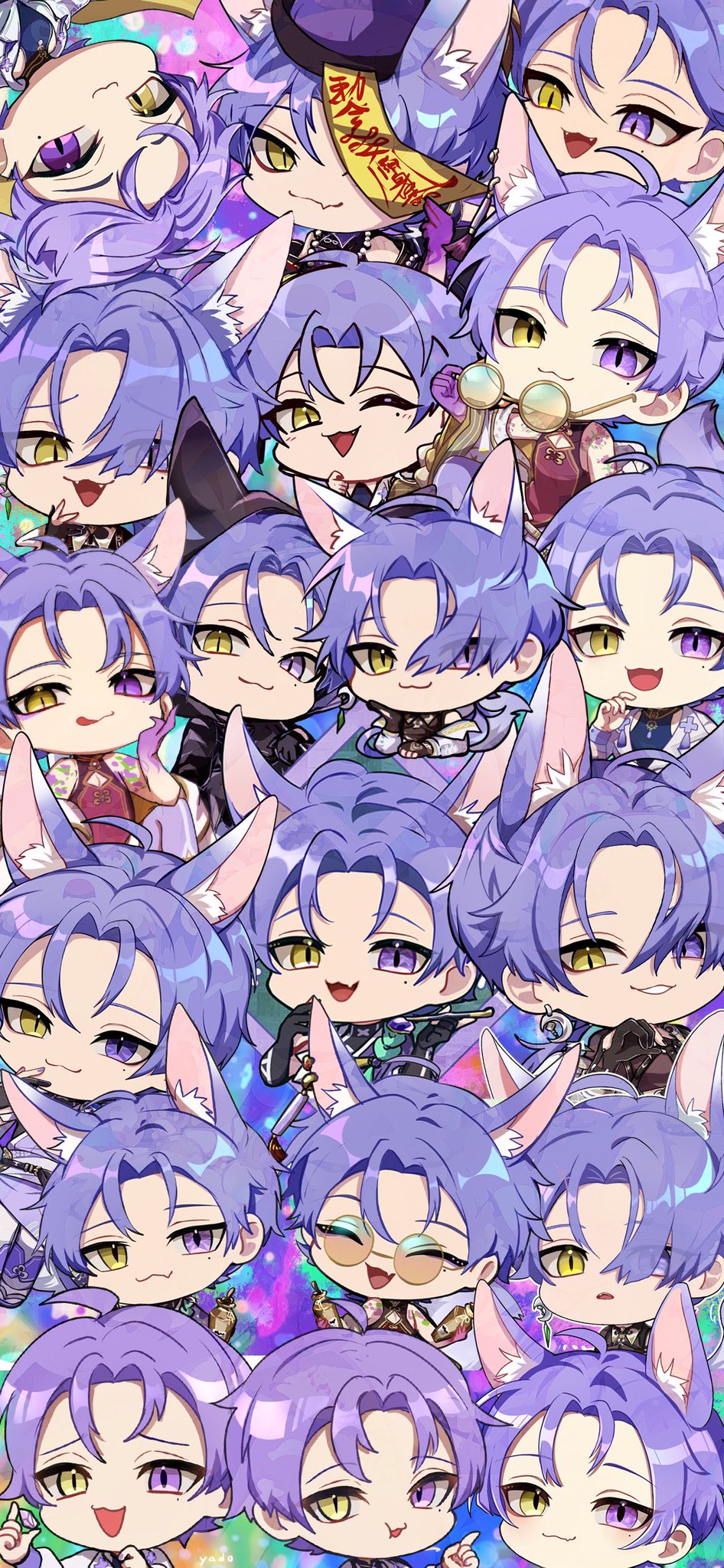 6+boys ahoge animal_ear_fluff animal_ears beads bottle cat_eyes cat_smile chibi chinese_clothes cigarette closed_eyes closed_mouth earrings ears_up eyelashes eyeliner eyeshadow fang fox_boy fox_ears fox_tail gem glasses gloves halloween_costume hand_to_own_mouth happy hat heterochromia highres holding holding_bottle holding_cigarette holding_gem holding_glasses holding hood hood_up jewelry jiangshi kiseru kuya_(nu_carnival) looking_at_viewer makeup male_focus messy_hair mole mole_under_eye multiple_boys multiple_persona nu_carnival ofuda open_mouth pointing purple_eyes purple_fur purple_hair short_hair simple_background skin_fang slit_pupils smile smoking_pipe strap_gap tail teeth upper_body weapon yadome810 yellow_eyes