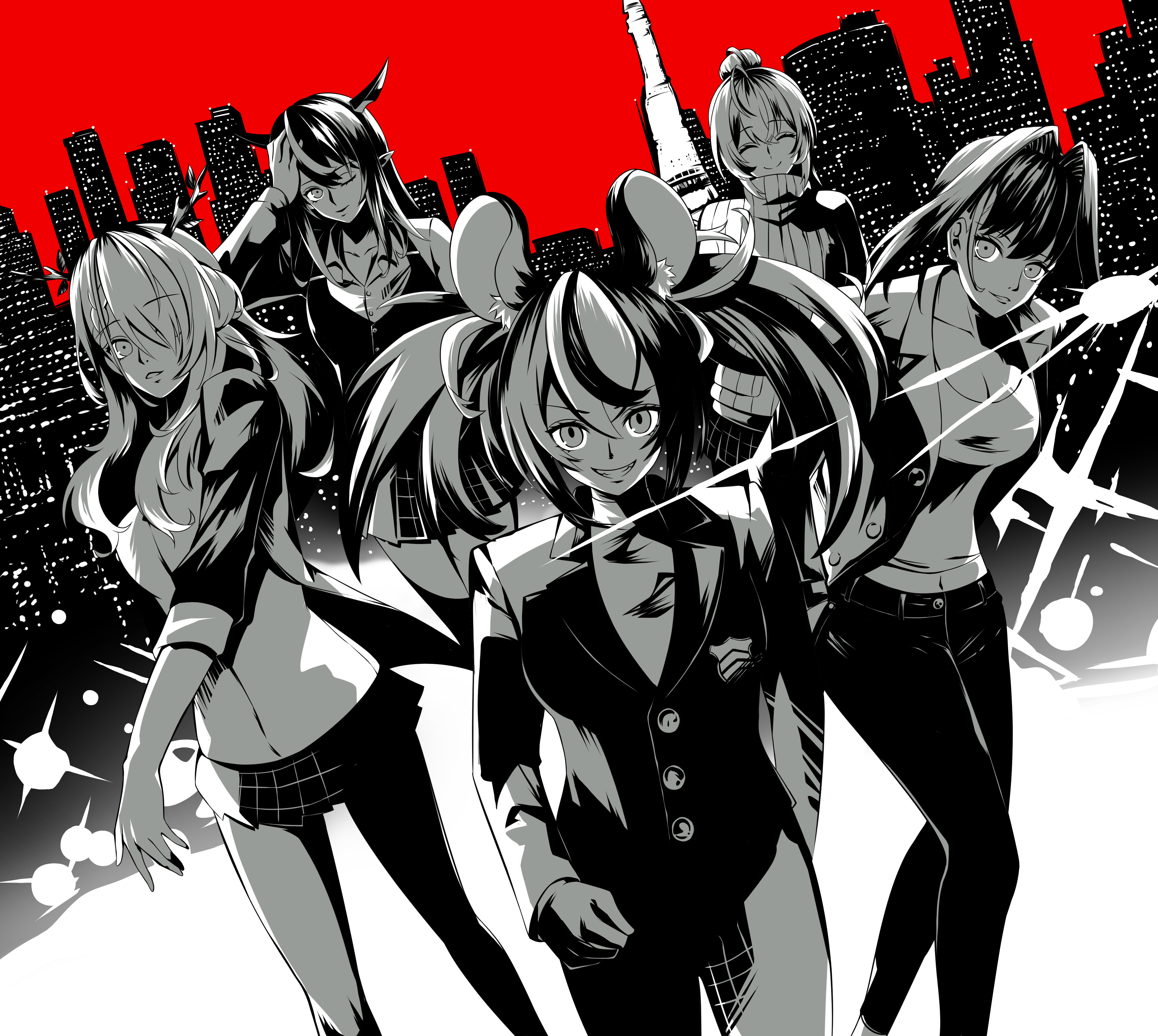 5girls absurdres amamiya_ren amamiya_ren_(cosplay) animal_ear_fluff animal_ears antlers blazer breasts building ceres_fauna cleavage cosplay denim derivative_work gloves greyscale_with_colored_background grin hair_intakes hakos_baelz high_ponytail highres hololive hololive_english holopromise horns irys_(hololive) jacket jeans kitagawa_yuusuke kitagawa_yuusuke_(cosplay) large_breasts looking_at_viewer miniskirt mouse_ears multiple_girls nanashi_mumei okumura_haru okumura_haru_(cosplay) ouro_kronii pants pantyhose parody persona persona_5 plaid_clothes plaid_skirt pointy_ears ponytail popcornflakes red_background sakamoto_ryuuji sakamoto_ryuuji_(cosplay) school_uniform short_hair shuujin_academy_school_uniform skirt smile sweater takamaki_anne turtleneck turtleneck_sweater twintails virtual_youtuber walking