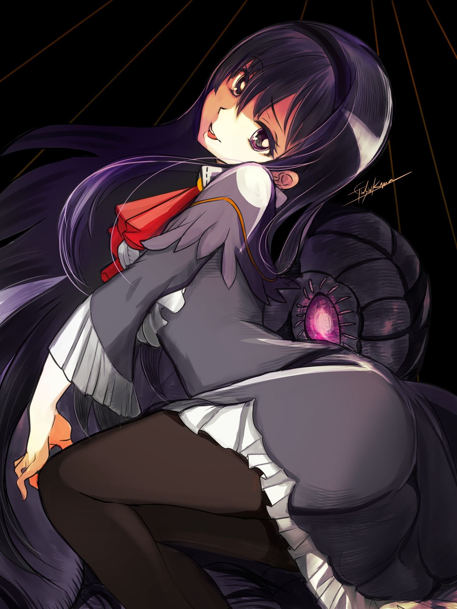 1girl akemi_homura black_hair bow bowtie gusukma highres long_hair long_sleeves looking_at_viewer mahou_shoujo_madoka_magica mahou_shoujo_madoka_magica:_walpurgis_no_kaiten purple_eyes smile solo