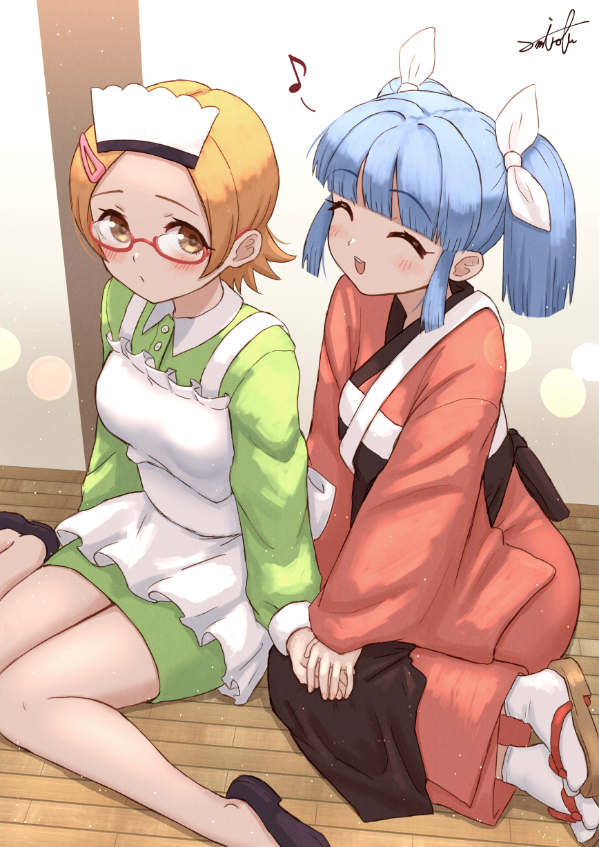 2girls :d ^_^ apron black_apron black_footwear blonde_hair blue_hair blush breasts brown_eyes brown_footwear brown_kimono closed_eyes closed_mouth collared_dress commentary_request dress frilled_apron frills green_dress hair_ribbon highres indoors japanese_clothes kimono long_sleeves multiple_girls on_floor open_mouth pani_poni_dash! parted_bangs puffy_long_sleeves puffy_sleeves ribbon sandals short_hair signature sleeves_past_wrists small_breasts smile socks suzuki_sayaka twintails uehara_miyako umiroku white_apron white_ribbon white_socks wide_sleeves wooden_floor zouri
