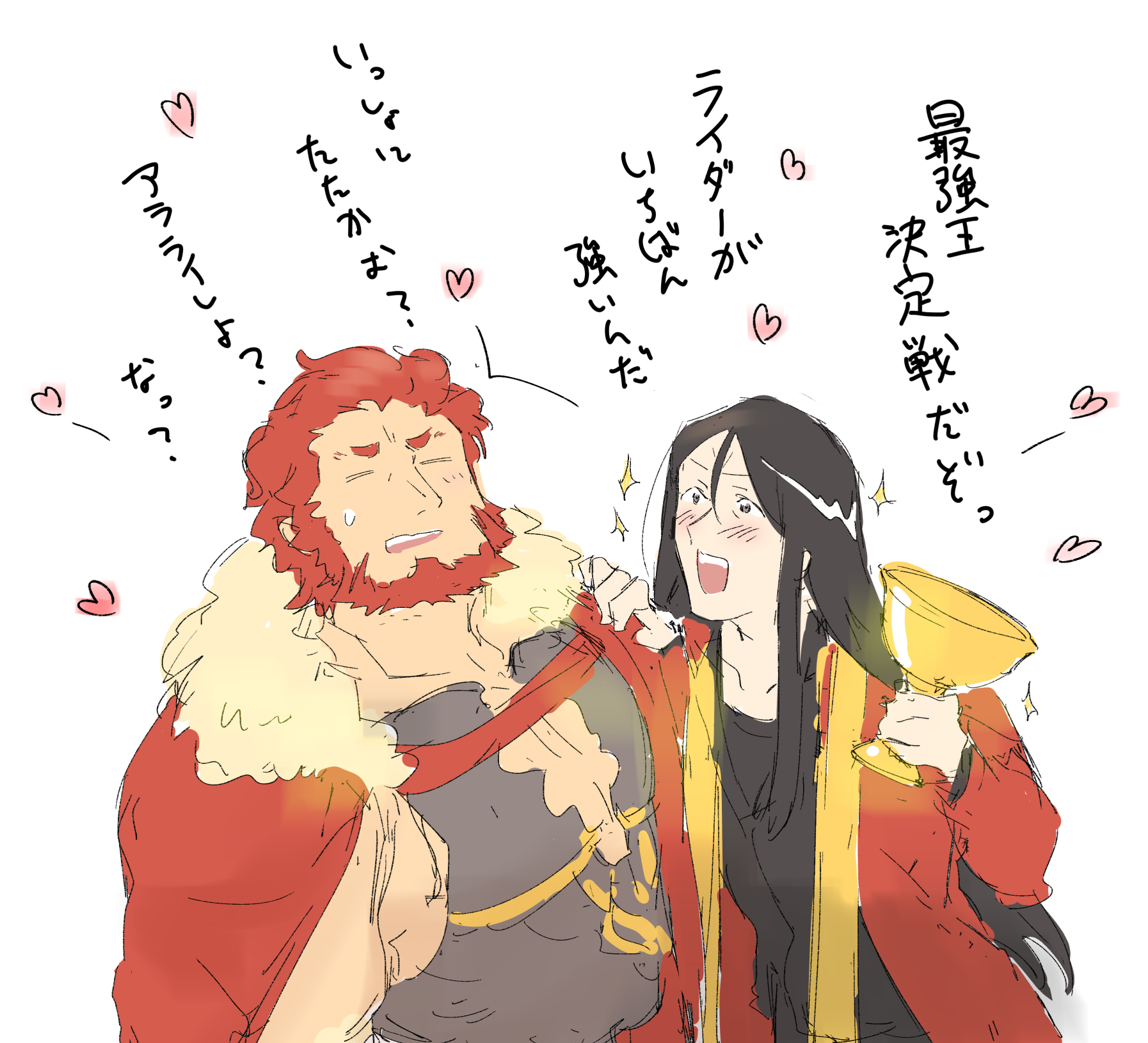2boys bara beard cape facial_hair fate/grand_order fate_(series) hand_on_another's_shoulder highres holy_grail_(fate) iskandar_(fate) large_pectorals light_blush long_hair lord_el-melloi_ii loving_aura male_focus multiple_boys muscular muscular_male pectoral_cleavage pectorals red_eyes red_hair shababuru short_hair sketch sparkle sweatdrop translation_request upper_body waver_velvet yaoi