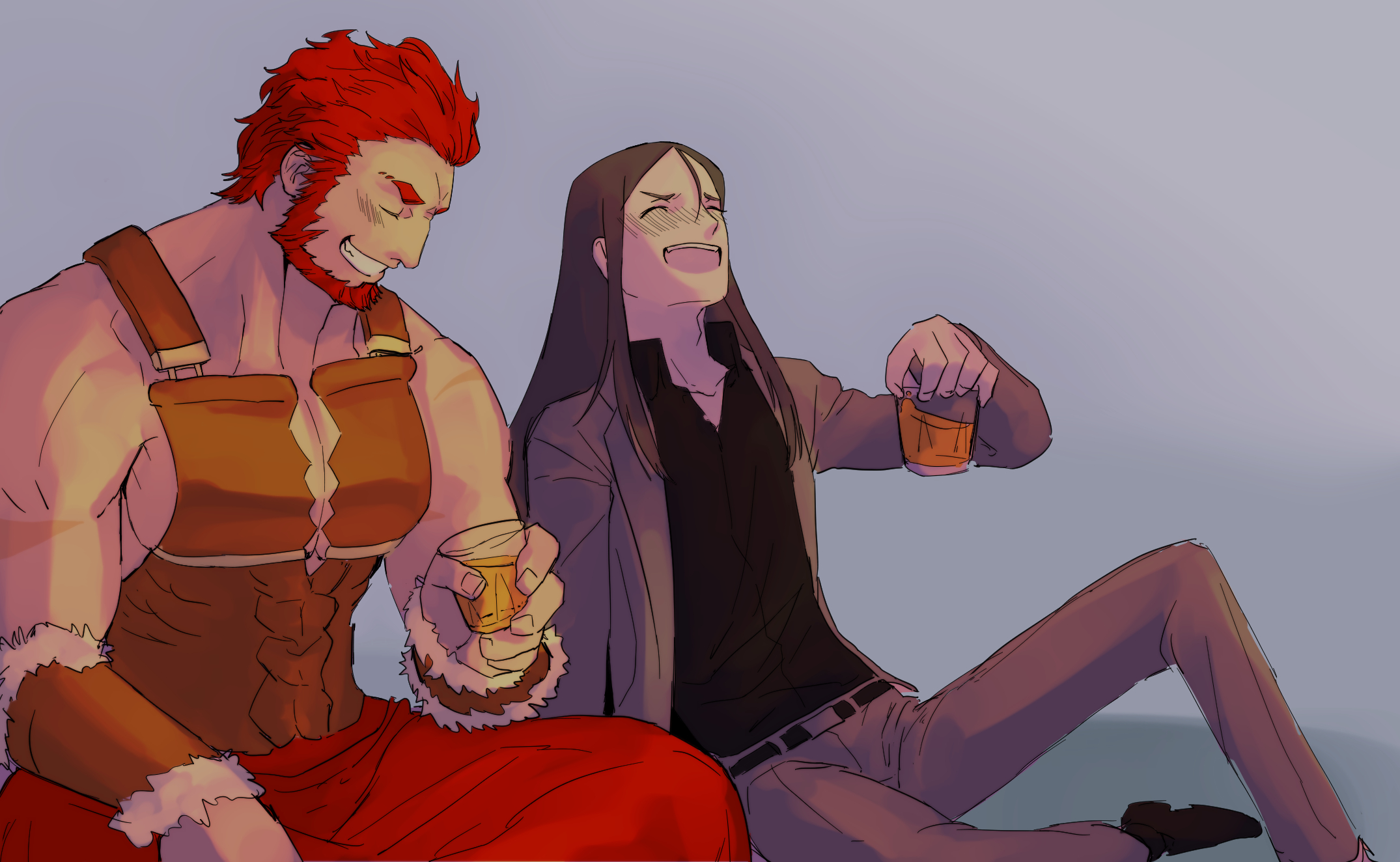 2boys :d ancient_greek_clothes beard cup drunk facial_hair fate/grand_order fate_(series) feet_out_of_frame greco-roman_clothes highres holding holding_cup iskandar_(fate) large_pectorals laughing long_hair lord_el-melloi_ii male_focus mature_male multiple_boys muscular muscular_male open_mouth pectoral_cleavage pectorals red_eyes red_hair shababuru short_hair side-by-side sidepec sitting smile waver_velvet
