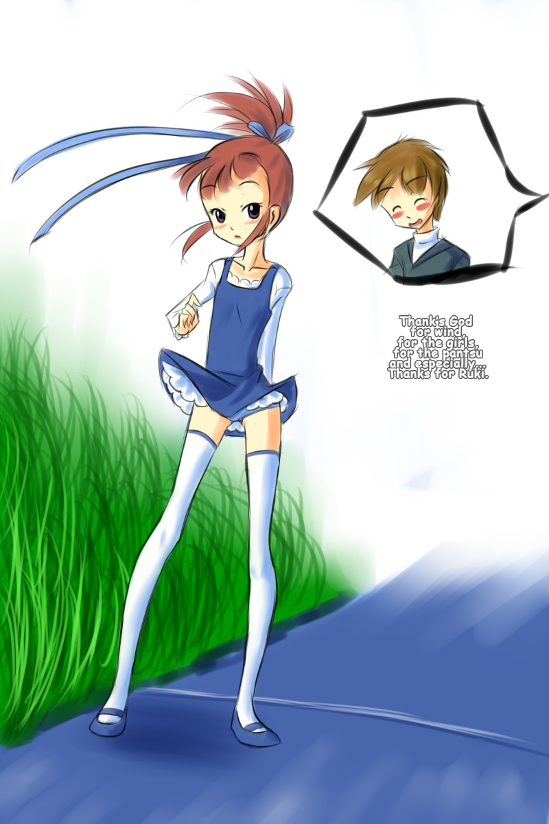 1boy 1girl blue_dress blue_footwear blue_panties blue_ribbon blush brown_hair closed_eyes collarbone digimon digimon_tamers drantyno dress grass hair_ribbon highres long_hair long_sleeves makino_ruki matsuda_takato open_mouth panties ponytail purple_eyes red_hair ribbon shirt shoes short_hair sleeveless sleeveless_dress smile standing thighhighs underwear white_shirt white_thighhighs wind wind_lift
