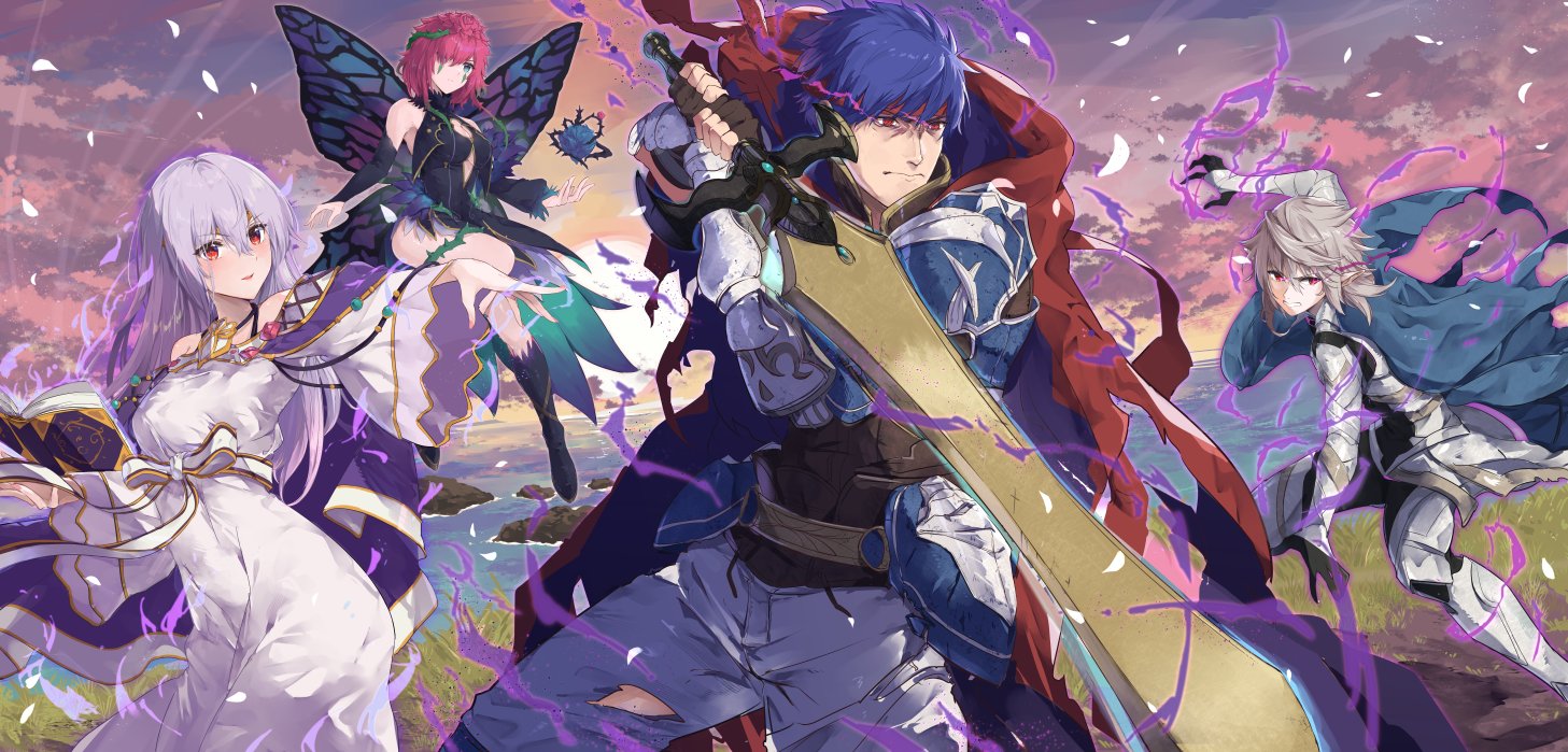 aura blue_hair commission fairy fairy_wings fire_emblem fire_emblem:_genealogy_of_the_holy_war fire_emblem:_radiant_dawn fire_emblem_awakening fire_emblem_heroes holding holding_sword holding_weapon ike_(brave_mercenary)_(fire_emblem) ike_(fire_emblem) julia_(fire_emblem) julia_(heart_usurped)_(fire_emblem) looking_to_the_side male_corrin_(fire_emblem) nintendo pointy_ears purple_hair red_eyes skeb_commission sword triandra_(fire_emblem) weapon wings yuuri_(orz_commushows)