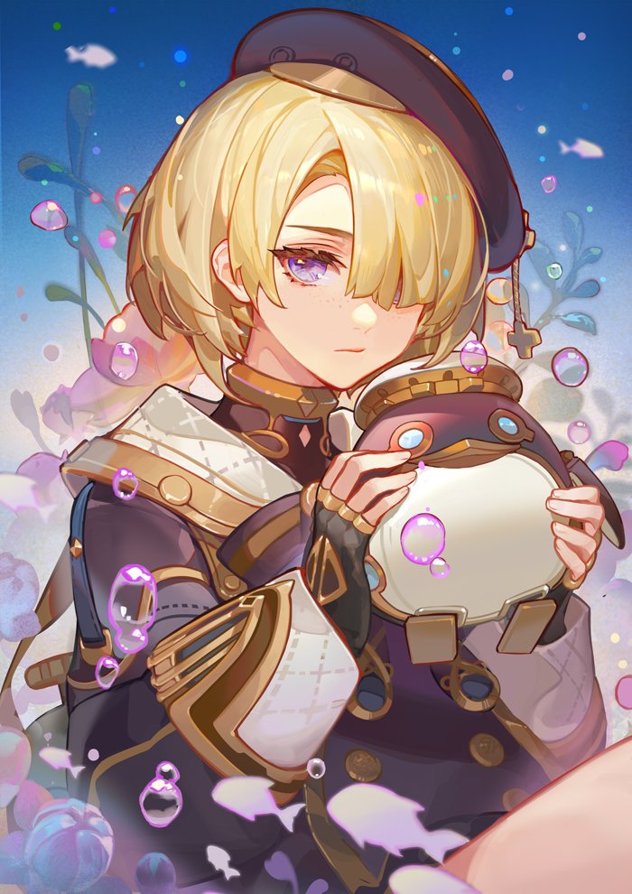 1boy beret black_gloves black_hat black_jacket blonde_hair blunt_bangs bubble closed_mouth commentary expressionless eyelashes fingerless_gloves fish flower freckles freminet_(genshin_impact) genshin_impact gloves gold_trim hair_over_one_eye hands_up hat holding jacket long_sleeves looking_at_viewer male_focus non-humanoid_robot one_eye_covered parted_bangs pers_(genshin_impact) purple_eyes robot robot_animal seaweed short_hair sidelocks sleeve_cuffs solo songjikyo underwater upper_body