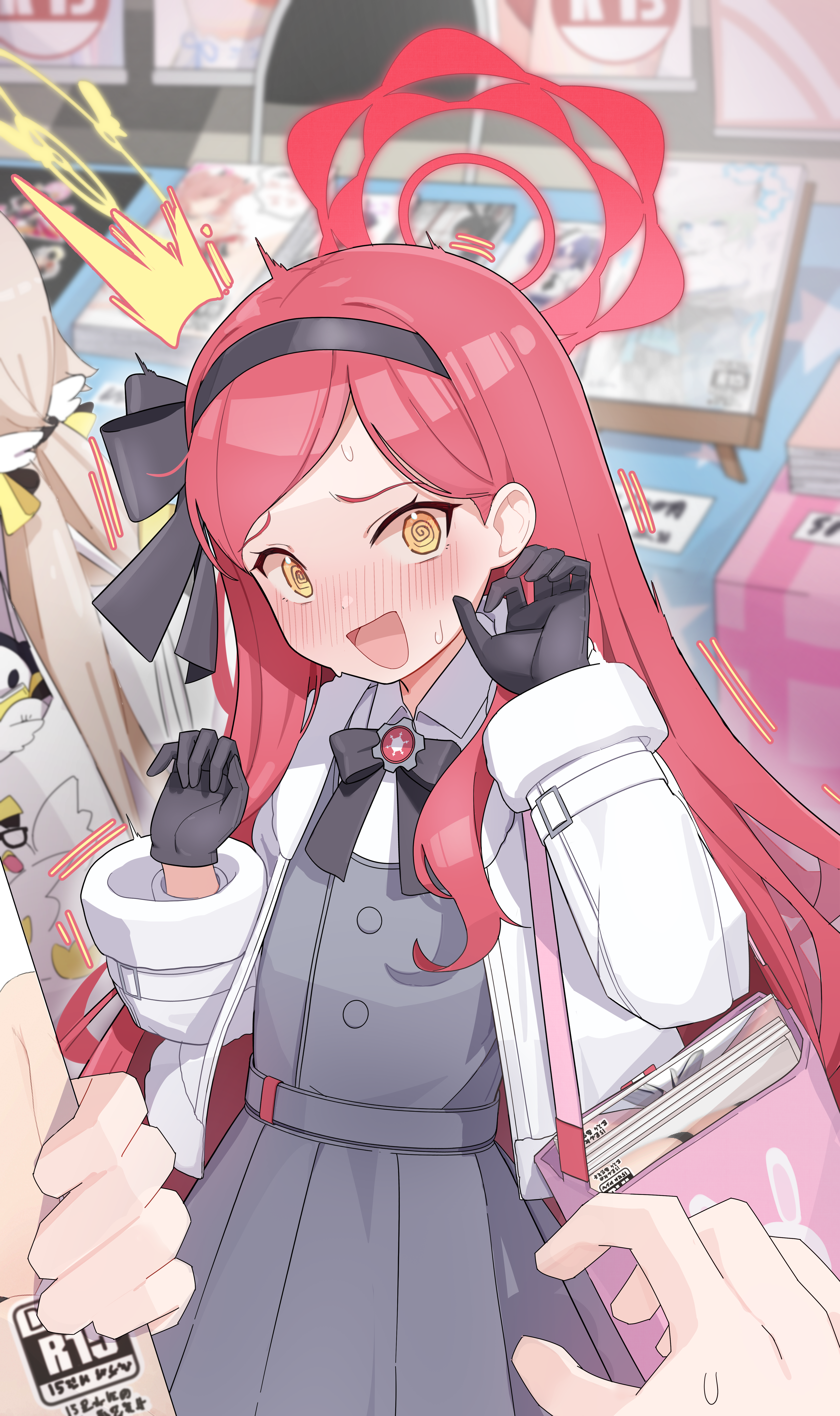 2girls @_@ absurdres black_bow black_bowtie black_gloves black_hairband blue_archive blush book bow bowtie dress fur-trimmed_jacket fur-trimmed_sleeves fur_trim gloves hairband halo hands_up hifumi_(blue_archive) highres jacket kirara_(blue_archive) long_hair long_sleeves looking_at_viewer multiple_girls open_mouth patanda pinafore_dress pink_bag red_hair red_halo shigure_(blue_archive) sleeveless sleeveless_dress solo_focus surprised sweatdrop takane_(blue_archive) very_long_hair white_jacket yellow_eyes yuuka_(blue_archive)