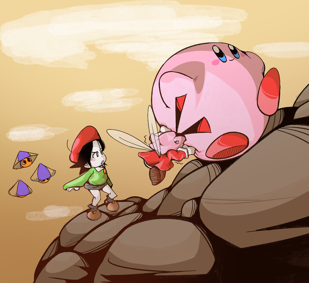 2girls adeleine anger_vein blush_stickers bumber_(kirby) colored_skin drawfag fairy fairy_wings fine_art_parody hat kirby kirby's_dream_buffet kirby_(series) kirby_64 multiple_girls nintendo parody pink_hair pink_skin pushing red_hat red_headwear red_ribbon ribbon ribbon_(kirby) sisyphus_(mythology) sky solid_oval_eyes wings yellow_sky