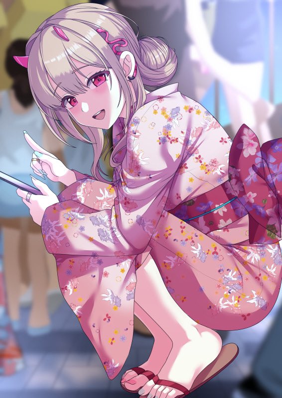 :d alternate_costume aqua_nails blush cellphone chiraimori_tt earrings from_side goddess_of_victory:_nikke hair_intakes holding holding_phone horns japanese_clothes jewelry kimono light_brown_hair long_hair looking_at_viewer multiple_girls nail_polish open_mouth phone pink_eyes pink_kimono pink_nails ring sandals sidelocks smartphone smile solo_focus viper_(nikke) zouri