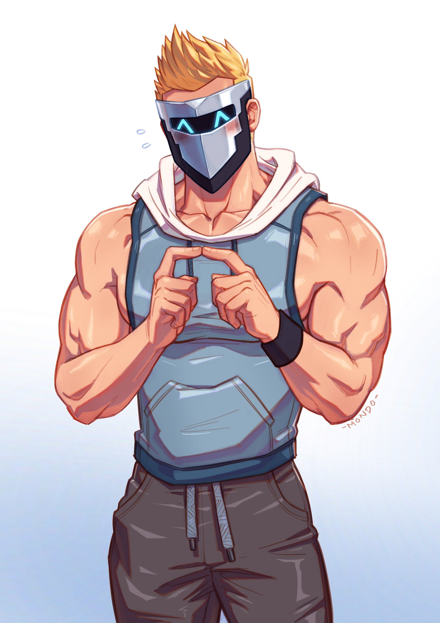 1boy ^_^ bara blonde_hair blush closed_eyes facing_viewer fidgeting highres hood hoodie index_fingers_together indie_virtual_youtuber large_pectorals male_focus mask masked_himbo_(silvyspark) mondoart muscular muscular_male nervous pants pectorals second-party_source short_hair sidepec sleeveless sleeveless_hoodie solo thighs virtual_youtuber
