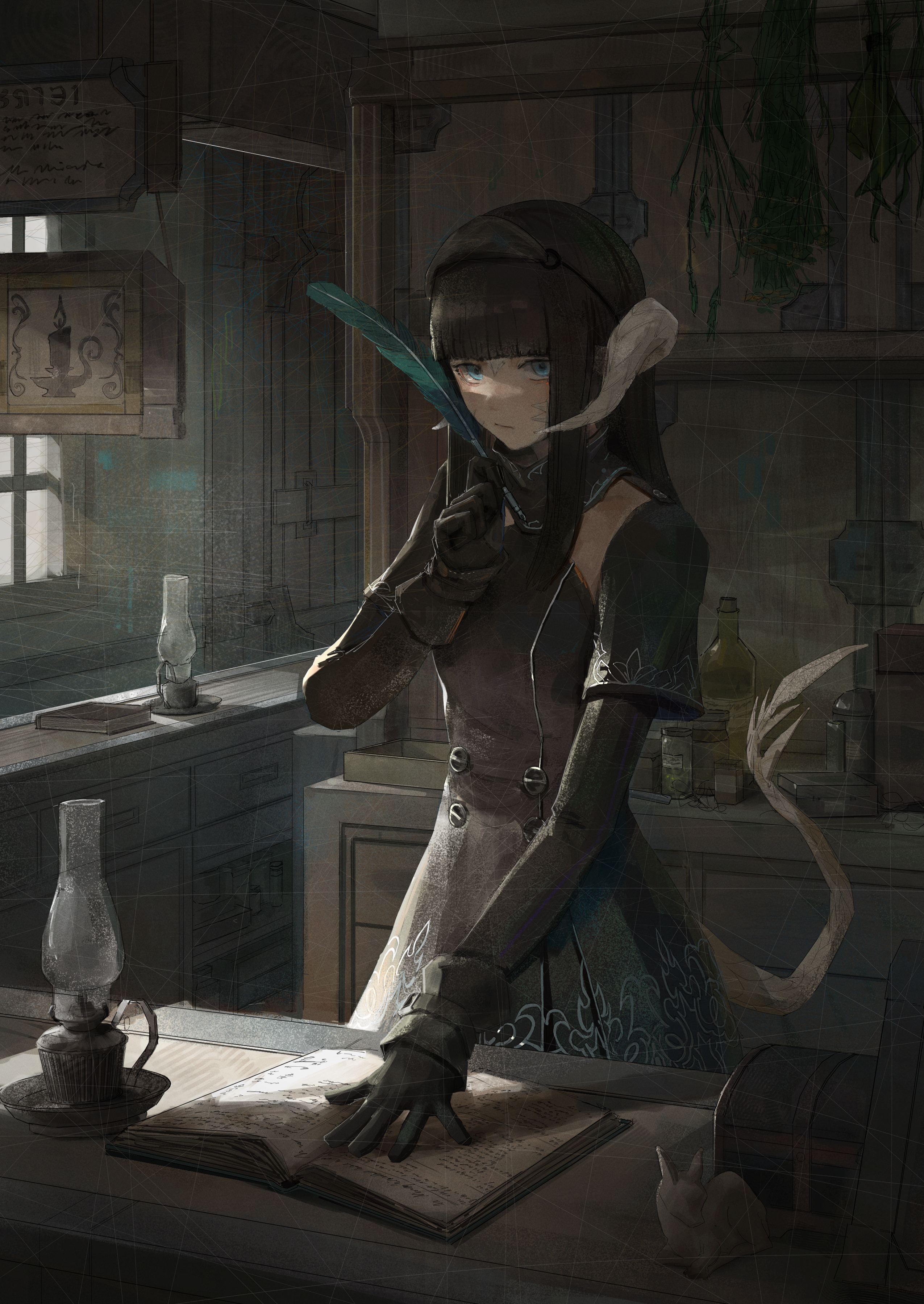 1girl absurdres au_ra black_dress black_gloves black_hair blue_eyes blunt_bangs blunt_ends book bottle buttons cowboy_shot curled_horns day detached_collar dragon_girl dragon_horns dragon_tail drawer dress expressionless final_fantasy final_fantasy_xiv from_side gloves hand_up herb_bundle highres hime_cut holding holding_quill horns indoors long_hair looking_at_viewer mask mask_on_head oil_lamp open_book quill scales scenery sleepwalker_(1219954168) solo spiked_tail standing straight_hair sunlight tail warrior_of_light_(ff14) window