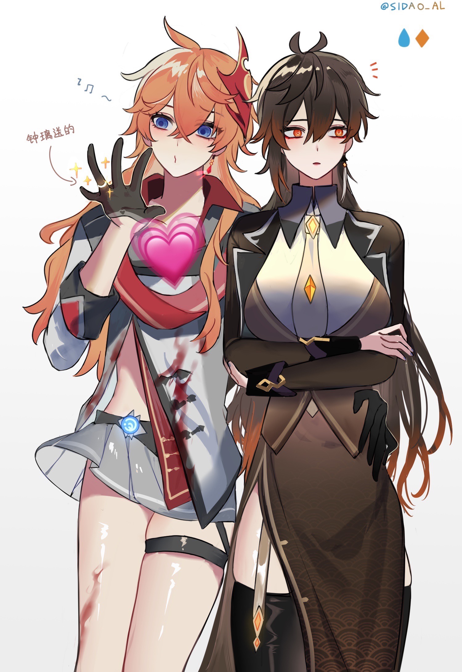 2girls genderswap genderswap_(mtf) genshin_impact hand_on_another's_hip hand_on_another's_waist highres long_hair looking_to_the_side multiple_girls notice_lines pink_heart sidao_al tartaglia_(genshin_impact) white_background zhongli_(genshin_impact)