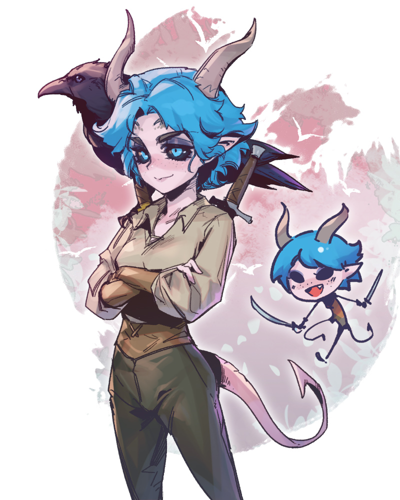 1girl animal baldur's_gate baldur's_gate_3 bird black_sclera blue_eyes blue_hair breasts brown_pants collarbone colored_sclera crossed_arms crow demon_horns dual_wielding dungeons_&_dragons freckles green_shirt holding holding_sword holding_weapon horns multicolored_background multiple_views original pants phantom_cross shirt short_hair small_breasts smile sword tail weapon