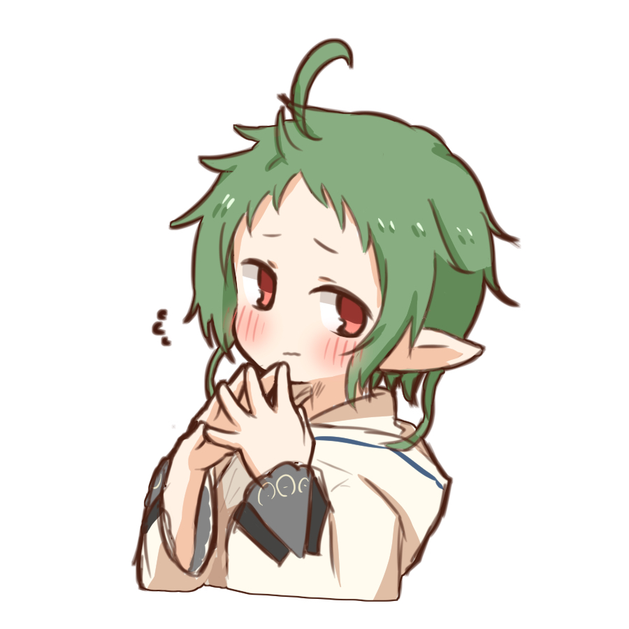 1girl ahoge blush elf flying_sweatdrops green_hair hands_up hood hooded_jacket jacket mushoku_tensei pointy_ears red_eyes short_hair solo sylphiette_(mushoku_tensei) upper_body white_background white_jacket yugudora