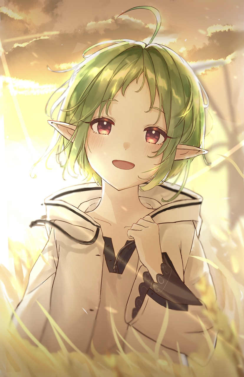 1girl ahoge cloud elf evening green_hair highres hood hooded_jacket jacket looking_at_viewer mushoku_tensei naruse_u open_mouth outdoors pointy_ears red_eyes shirt short_hair sky solo sunset sylphiette_(mushoku_tensei) wheat_field white_jacket white_shirt