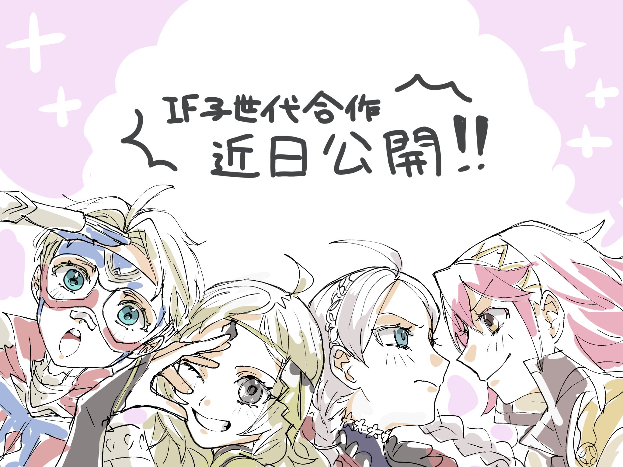 1boy 3girls ahoge blonde_hair blue_eyes braid choker circlet eye_mask fire_emblem fire_emblem_fates grey_eyes grey_hair highres kataagetokage looking_at_another looking_at_viewer low_twin_braids mask multiple_girls nina_(fire_emblem) nintendo open_mouth ophelia_(fire_emblem) parted_bangs percy_(fire_emblem) pink_hair soleil_(fire_emblem) swept_bangs translation_request twin_braids