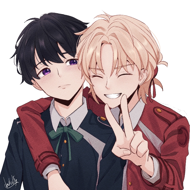 2boys arm_around_shoulder black_hair blonde_hair chxoswolf closed_eyes genderswap genderswap_(ftm) grin inoue_takina lycoris_recoil lycoris_uniform male_focus multiple_boys nishikigi_chisato purple_eyes short_hair signature simple_background smile upper_body v white_background