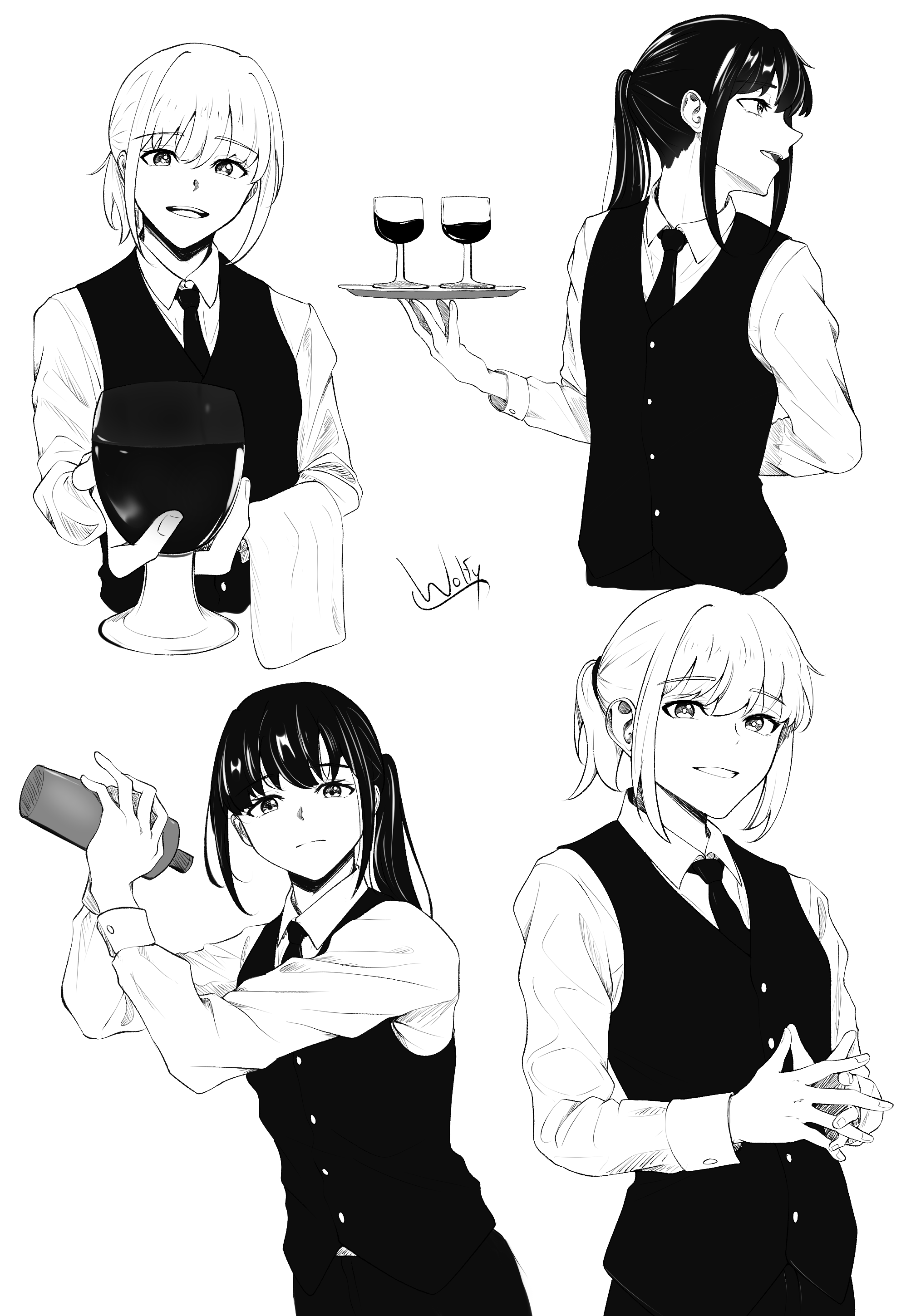 2girls absurdres alternate_hairstyle bartender black_hair chxoswolf cup highres holding holding_tray inoue_takina long_hair looking_at_viewer lycoris_recoil monochrome multiple_girls multiple_views necktie nishikigi_chisato ponytail signature simple_background smile steepled_fingers tray vest waiter white_background