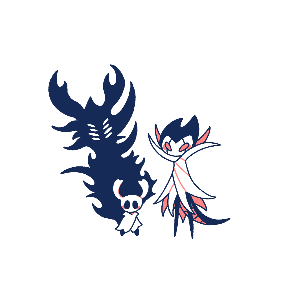 1boy 1other arthropod_boy blank_eyes blush blush_stickers cloak dual_persona extra_eyes full_body grimm_(hollow_knight) high_collar hollow_knight knight_(hollow_knight) looking_at_viewer red_eyes sakana_2-gou shadow simple_background spoilers standing tail void_entity_(hollow_knight) white_background