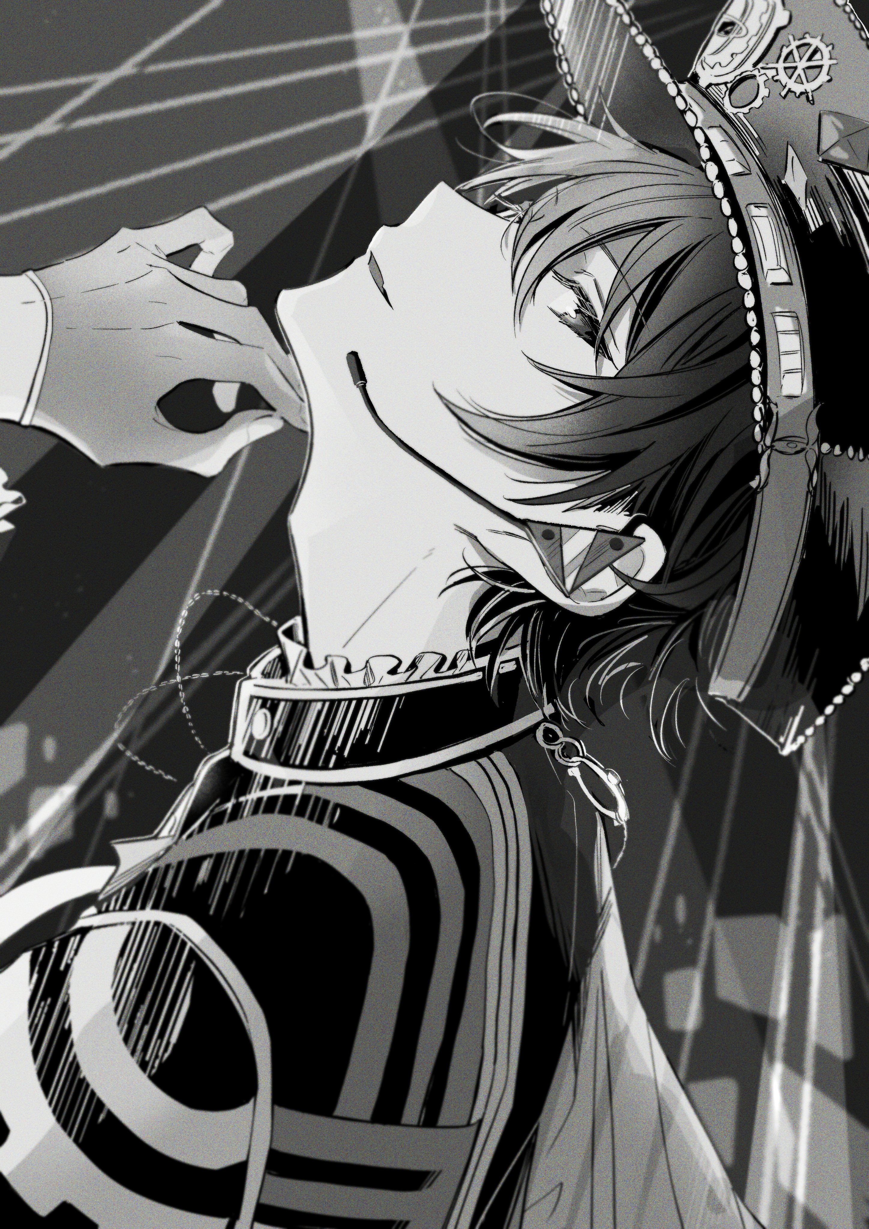 1boy absurdres commentary_request ensemble_stars! gears gloves greyscale hand_up headset highres kagehira_mika looking_at_viewer machina_(ensemble_stars!) male_focus monochrome ninomiya_(t_238_t) official_alternate_costume parted_lips short_hair sideways_glance solo upper_body