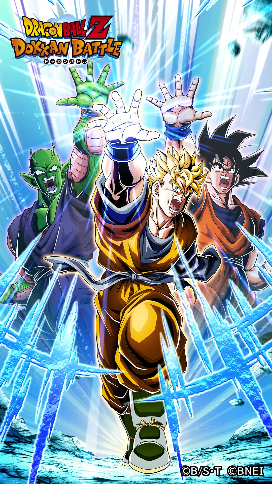 3boys dokkan_battle dragon_ball energy father-son_kamehameha father_and_child father_and_son highres kamehameha_(dragon_ball) master_and_pupil multiple_boys muscular muscular_male official_art parent_and_child piccolo powering_up scar scar_across_eye scar_on_face screaming son_gohan son_gohan_(future) son_goku super_saiyan tagme