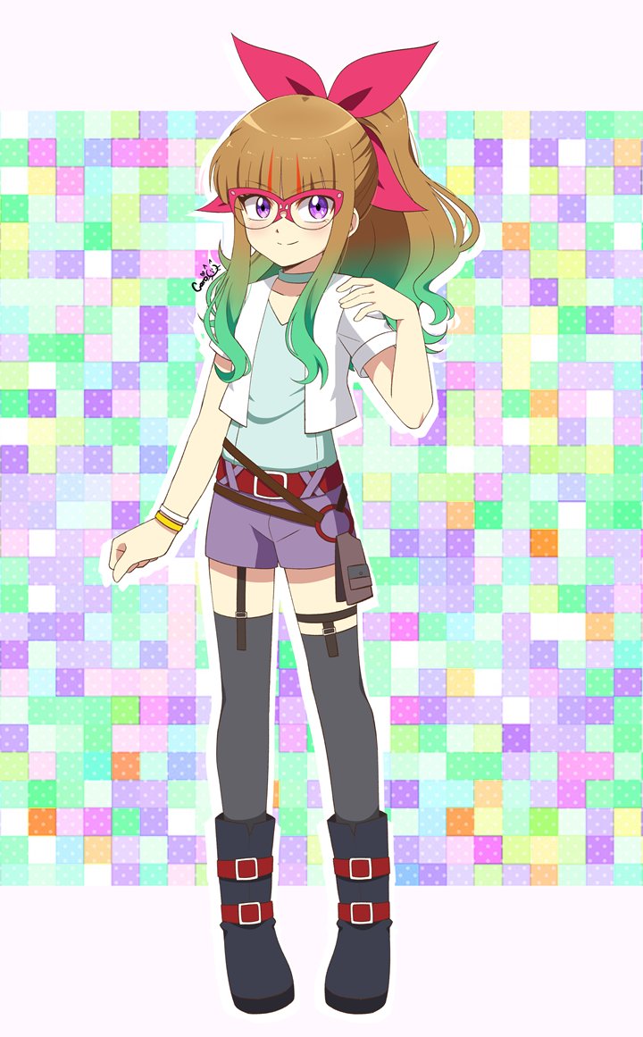 1girl belt black_footwear black_thighhighs brown_hair caro-xy glasses hair_ribbon long_hair looking_at_viewer multicolored_hair ohdo_yuamu ponytail purple_eyes red-framed_eyewear ribbon shorts thighhighs two-tone_hair yu-gi-oh! yu-gi-oh!_go_rush!!