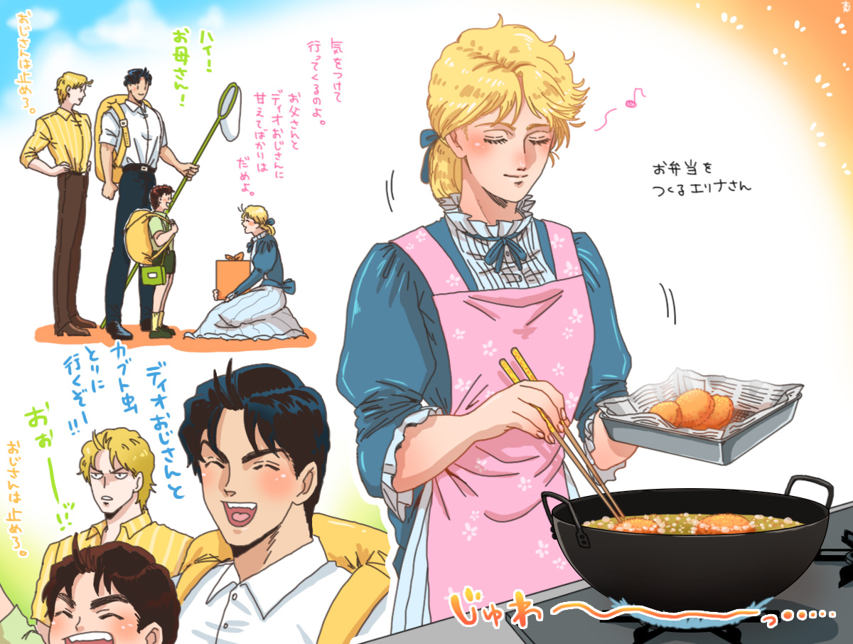 1girl 3boys alternate_universe anachronism apron backpack bag black_hair blonde_hair blue_dress brown_hair chopsticks commentary_request cooking dio_brando dress eighth_note erina_pendleton family father_and_child father_and_son food george_joestar_ii hand_net holding holding_chopsticks jojo_no_kimyou_na_bouken jonathan_joestar kneeling mother_and_child mother_and_son mugicha_(zoro1132) multiple_boys musical_note parent_and_child phantom_blood pink_apron steam stove translation_request wok wrapped_bento