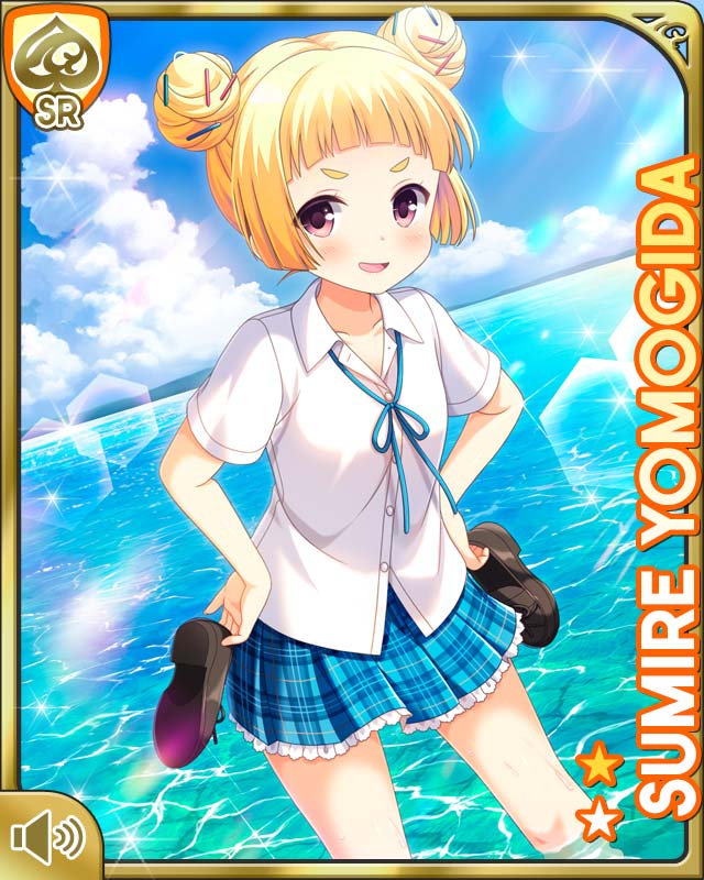 1girl :d bare_legs barefoot beach blonde_hair blue_neckwear blue_skirt card_(medium) character_name day double_bun girlfriend_(kari) hair_bun hand_on_own_hip ocean official_art open_mouth outdoors petticoat plaid_clothes plaid_skirt purple_eyes qp:flapper school_uniform shirt skirt smile solo standing tagme v-shaped_eyebrows wading white_shirt yomogida_sumire