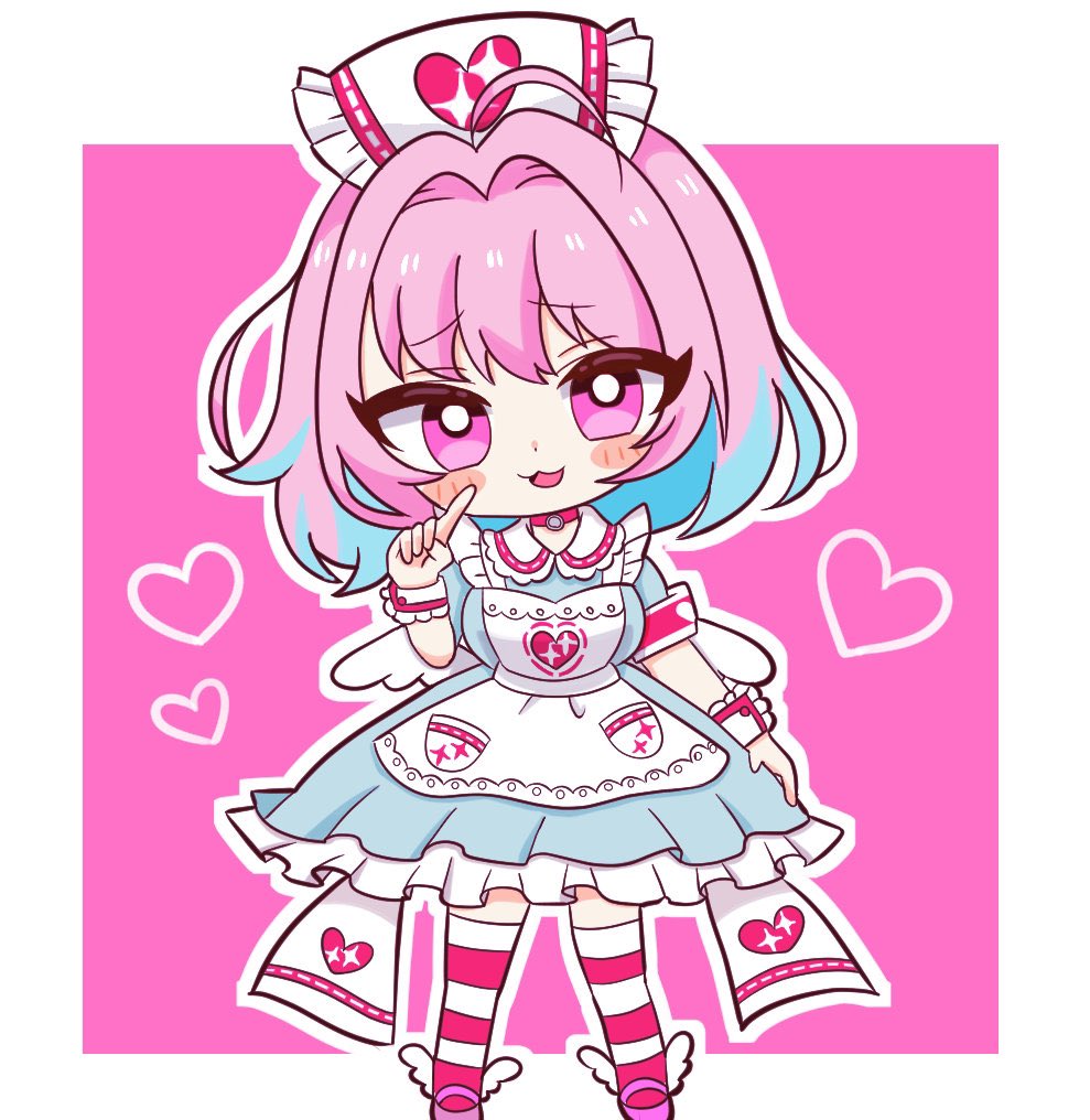 1girl ahoge apron armband blue_dress blue_hair breasts chibi choker commentary dress fake_wings finger_to_cheek frilled_apron frills hair_intakes hand_up heart heart_print idolmaster idolmaster_cinderella_girls idolmaster_cinderella_girls_starlight_stage index_finger_raised looking_at_viewer medium_breasts medium_hair multicolored_hair nakaya_tora official_alternate_costume open_mouth petticoat pink_armband pink_background pink_choker pink_eyes pink_hair pink_shoes pink_thighhighs puffy_short_sleeves puffy_sleeves raised_eyebrows shoes short_sleeves simple_background smile solo sparkle_print striped_clothes striped_thighhighs thighhighs two-tone_hair white_apron white_headwear white_thighhighs white_wings winged_footwear wings wrist_cuffs yumemi_riamu
