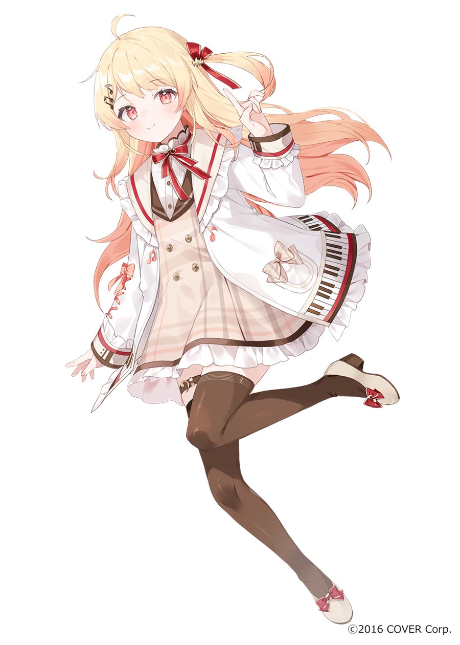 1girl ahoge belt blonde_hair bow closed_mouth commentary_request dress fortissimo frills full_body hair_bow hair_ornament hand_up high_heels highres hololive hololive_dev_is jacket long_hair long_sleeves looking_at_viewer mokyuko musical_note musical_note_hair_ornament official_art one_side_up open_clothes open_jacket otonose_kanade otonose_kanade_(1st_costume) red_bow red_eyes shoes simple_background smile solo thigh_strap thighhighs thighs virtual_youtuber white_background white_jacket zettai_ryouiki