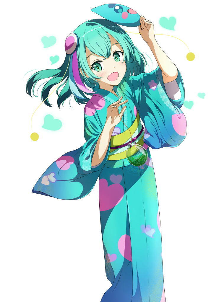 1girl :d aqua_hair arm_up blue_kimono character_mask commentary_request green_eyes hagoromo_lala hair_between_eyes heart heart_print holding holding_mask japanese_clothes kimono long_sleeves mask unworn_mask multicolored_hair obi open_mouth precure print_kimono prunce_(precure) purple_hair sash simple_background smile solo star_twinkle_precure streaked_hair tsuyukina_fuzuki white_background wide_sleeves yukata