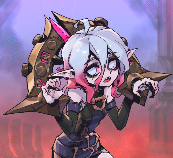 1girl ahoge bags_under_eyes belt black_belt briar_(league_of_legends) colored_sclera commentary detached_sleeves english_commentary fingernails gradient_background gradient_hair grey_hair hair_between_eyes korean_commentary league_of_legends long_hair looking_at_viewer looking_to_the_side multicolored_hair no_pupils open_mouth phantom_cross pink_hair pointy_ears red_sclera sharp_fingernails sharp_teeth sidelocks solo teeth two-tone_hair upper_body upper_teeth_only vampire white_eyes wrist_cuffs