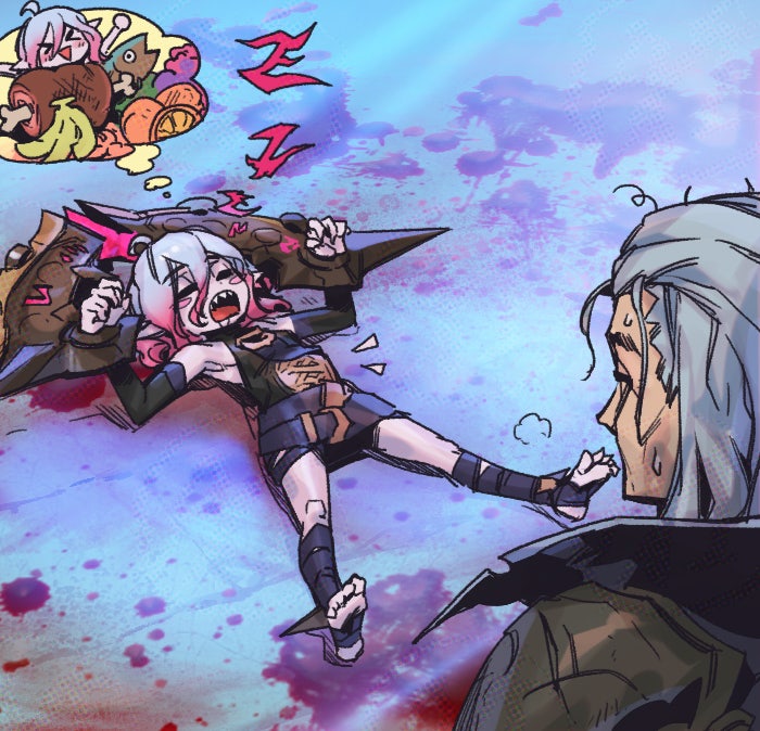 1boy 1girl ahoge banana belt black_belt black_jacket blood blood_on_ground blush briar_(league_of_legends) closed_eyes detached_sleeves dreaming drooling fish food fruit full_body gradient_hair grey_hair hair_between_eyes jacket league_of_legends legs lying meat multicolored_hair on_back on_ground open_mouth orange_(fruit) orange_slice phantom_cross pink_hair pointy_ears saliva sidelocks sleeping soles stirrup_legwear streaked_hair swain_(league_of_legends) sweatdrop toeless_legwear toes two-tone_hair upper_body vampire wrist_cuffs zzz