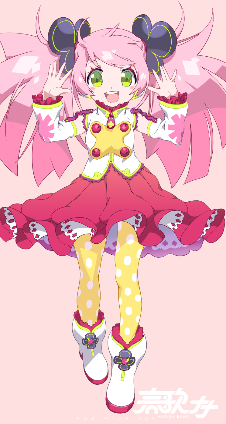 1girl :d blush_stickers boots detached_sleeves duplicate frilled_sleeves frills full_body green_eyes hair_ornament hands_up haruka_nana headphones highres long_hair looking_at_viewer nagimiso official_art open_mouth pantyhose pink_hair polka_dot polka_dot_legwear red_skirt skirt smile solo twintails utau white_boots yellow_pantyhose zipper