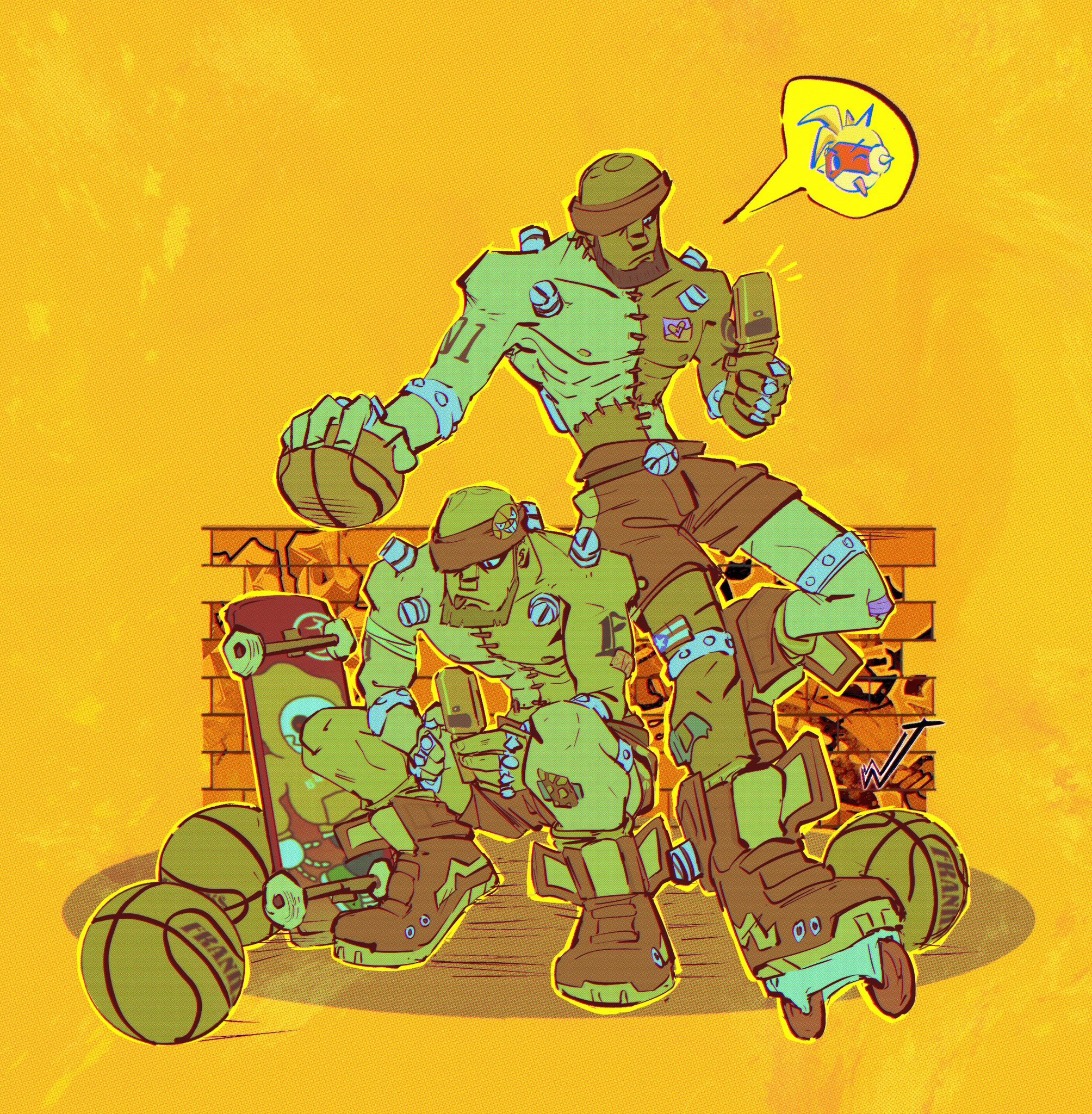 2boys :p arm_tattoo bald ball basketball basketball_(object) basketball_buckle beard belt bomb_rush_cyberfunk brick_wall brown_hair cellphone colored_skin dark-skinned_male dark_skin facial_hair flip_phone franks_(bomb_rush_cyberfunk) graffiti highres holding inline_skates looking_at_phone male_focus micro_boy multicolored_skin multiple_boys nipples one_eye_covered orange_background outline phone puerto_rican_flag red_shorts roller_skates screw shoes shorts simple_background skateboard skates sneakers spoken_character squatting sticker sticker_on_leg stitched_neck stitched_torso stitches sweatband tattoo tongue tongue_out topless_male wint_(draydensbeard) yellow_outline