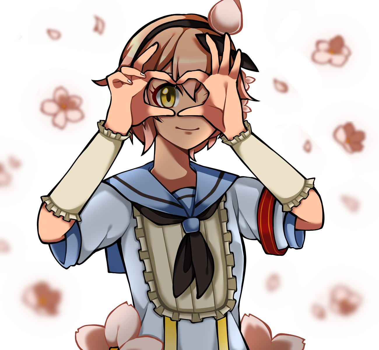1girl 1jumangoku arm_warmers black_hairband black_necktie black_ribbon blue_sailor_collar blue_shirt center_frills cherry_blossoms closed_mouth collared_shirt commentary_request dress_flower eyelashes falling_flower falling_petals floral_background flower frilled_arm_wamers frilled_arm_warmers frills hair_flower hair_ornament hair_ribbon hairband heart heart_hands heart_hands_over_eye highres looking_at_viewer magical_girl mahou_shoujo_ikusei_keikaku mahou_shoujo_ikusei_keikaku_unmarked necktie one_eye_closed petals pink_flower pink_hair ribbon sailor_collar shirt short_hair short_sleeves smile snow_white_(mahoiku) upper_body white_arm_warmers white_background yellow_eyes