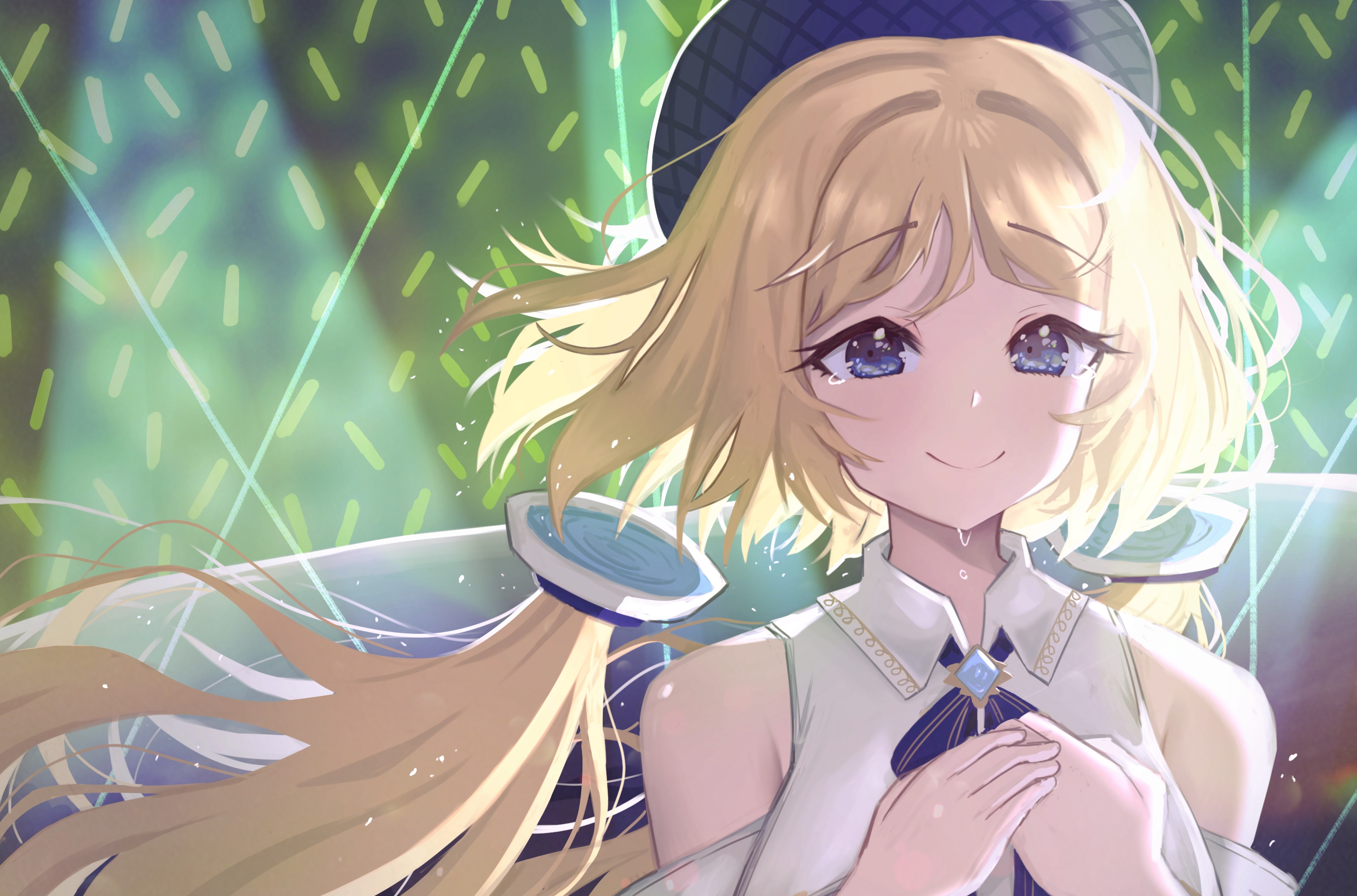 1girl aki_rosenthal black_headwear blonde_hair blue_bow blue_bowtie blue_eyes blue_journey_(hololive) bob_cut bow bowtie brooch close-up detached_hair detached_sleeves glowstick highres hololive jewelry low_twintails nyu-tan94 penlight_(glowstick) short_hair smile solo tears twintails virtual_youtuber
