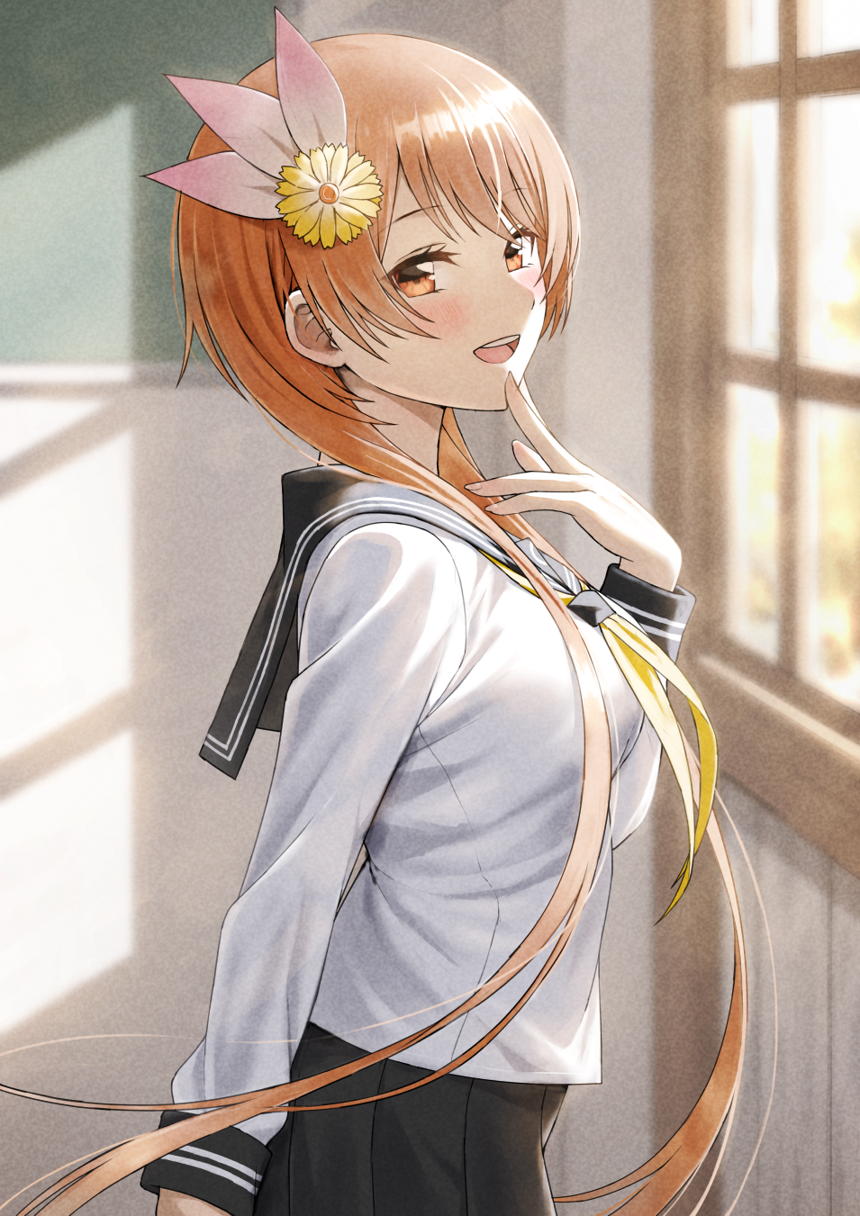 1girl blush breasts classroom fagi_(kakikaki) flower hair_flower hair_ornament highres indoors large_breasts long_hair looking_at_viewer looking_to_the_side neckerchief nisekoi orange_hair school_uniform serafuku smile solo tachibana_marika twintails upper_body very_long_hair yellow_neckerchief