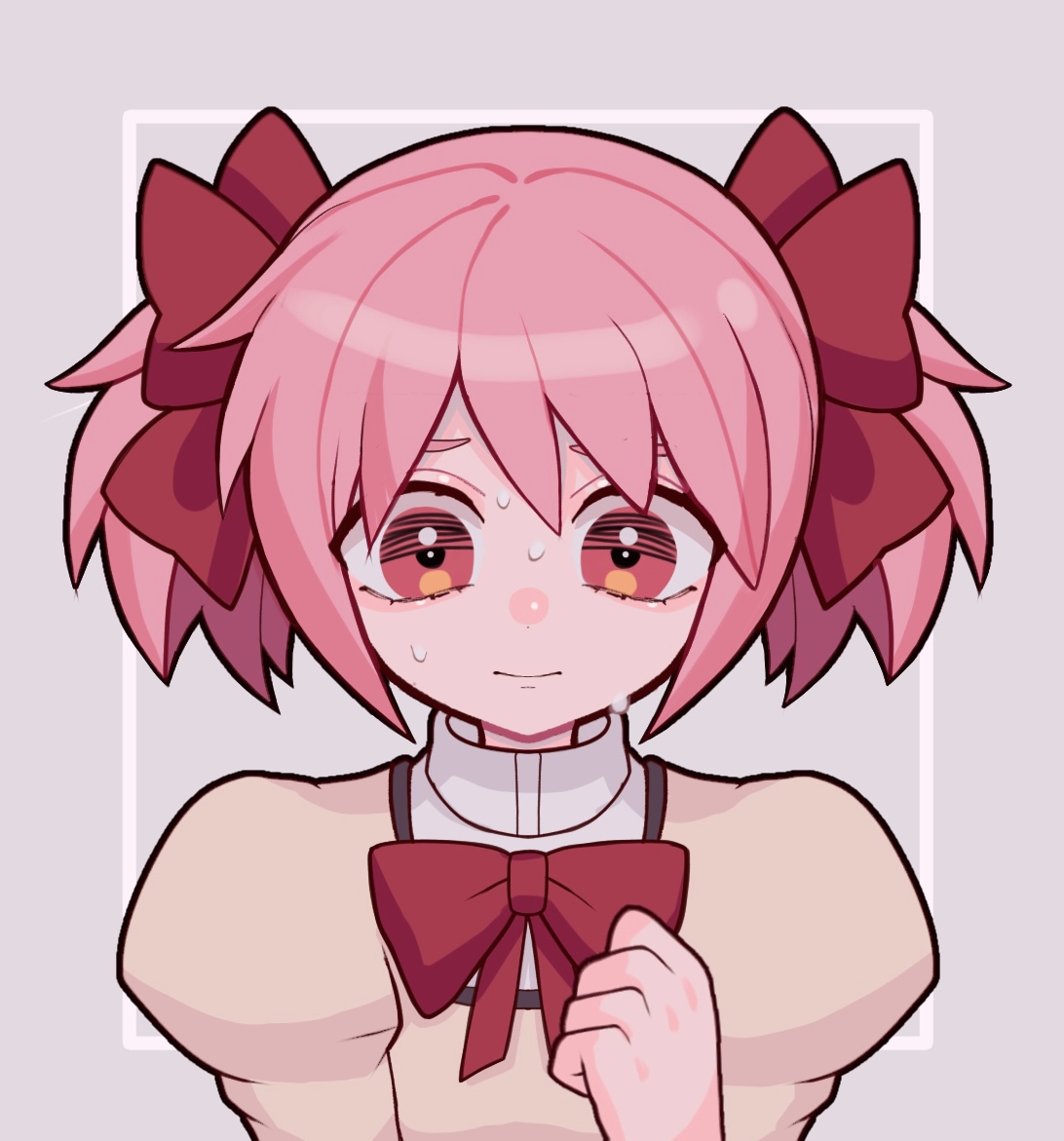 1girl bow clenched_hand grey_background hair_between_eyes hair_bow kaname_madoka keropiki mahou_shoujo_madoka_magica mitakihara_school_uniform nervous nervous_sweating pink_eyes pink_hair portrait puffy_sleeves red_bow red_ribbon ribbon school_uniform short_hair short_twintails solo sweat twintails
