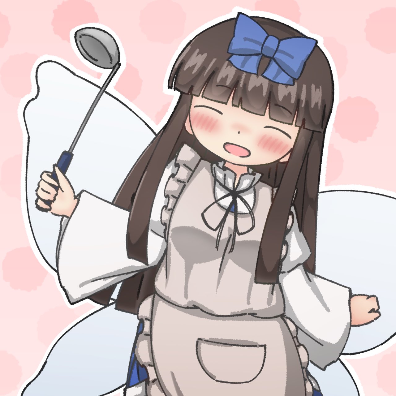1girl apron baystarsapphire black_hair black_ribbon blue_bow blunt_bangs blush bow brown_hair closed_eyes commentary_request cowboy_shot dot_nose facing_viewer fairy_wings frilled_apron frills grey_apron hair_bow hand_up happy highres holding holding_ladle juliet_sleeves ladle leaning_to_the_side long_hair long_sleeves neck_ribbon nose_blush open_mouth outline pink_background puffy_sleeves ribbon sidelocks simple_background smile solo star_sapphire touhou very_long_hair white_outline wide_sleeves wings