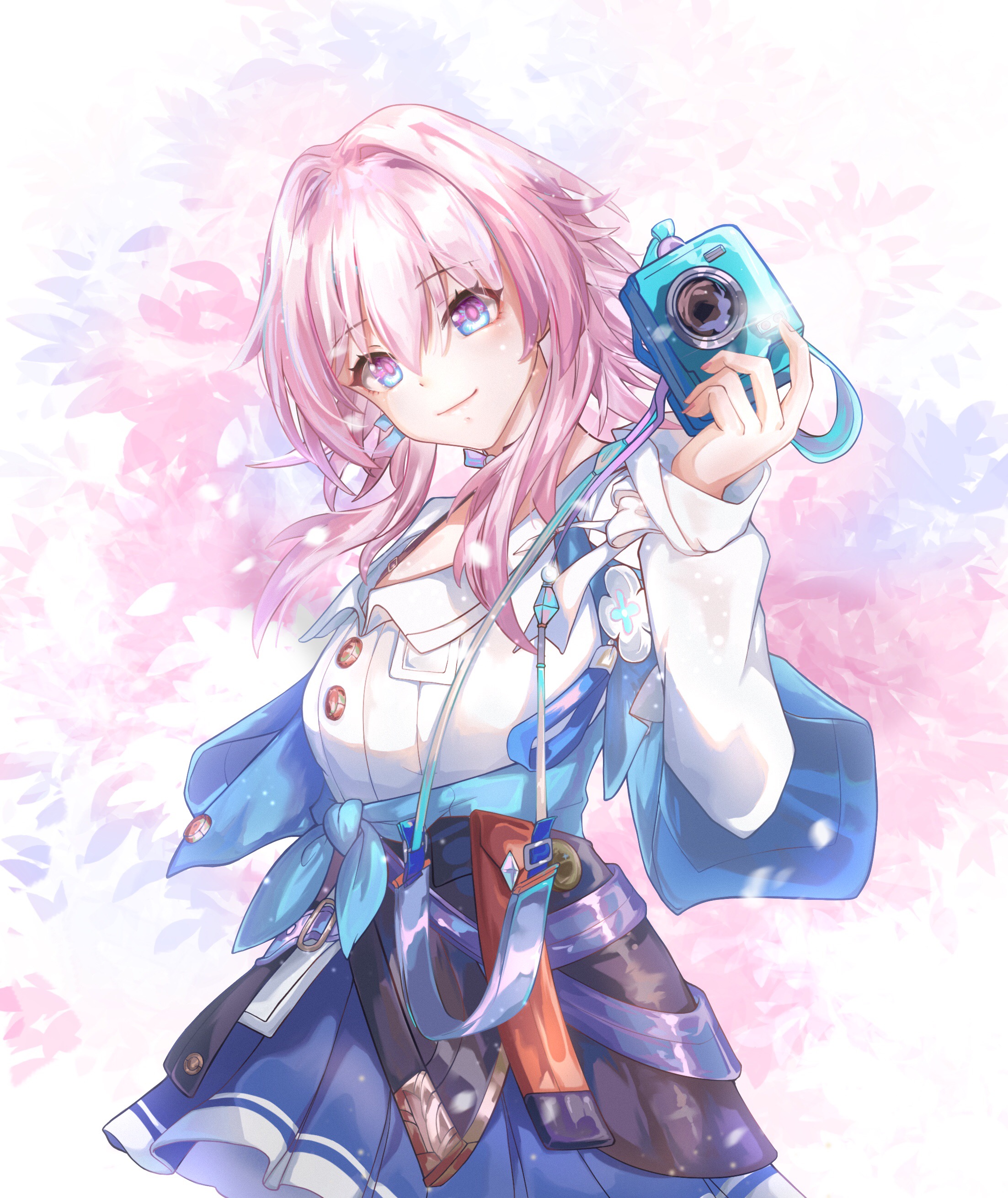1girl absurdres badge black_corset blue_eyes blue_jacket blue_skirt button_badge camera changerduo chinese_commentary choker closed_mouth commentary_request corset cowboy_shot earrings hair_intakes hand_up highres holding holding_camera honkai:_star_rail honkai_(series) jacket jewelry long_sleeves looking_at_viewer march_7th_(honkai:_star_rail) march_7th_(preservation)_(honkai:_star_rail) medium_hair multicolored_eyes pink_eyes pink_hair pleated_skirt shirt single_earring skirt solo tied_jacket two-tone_eyes white_shirt