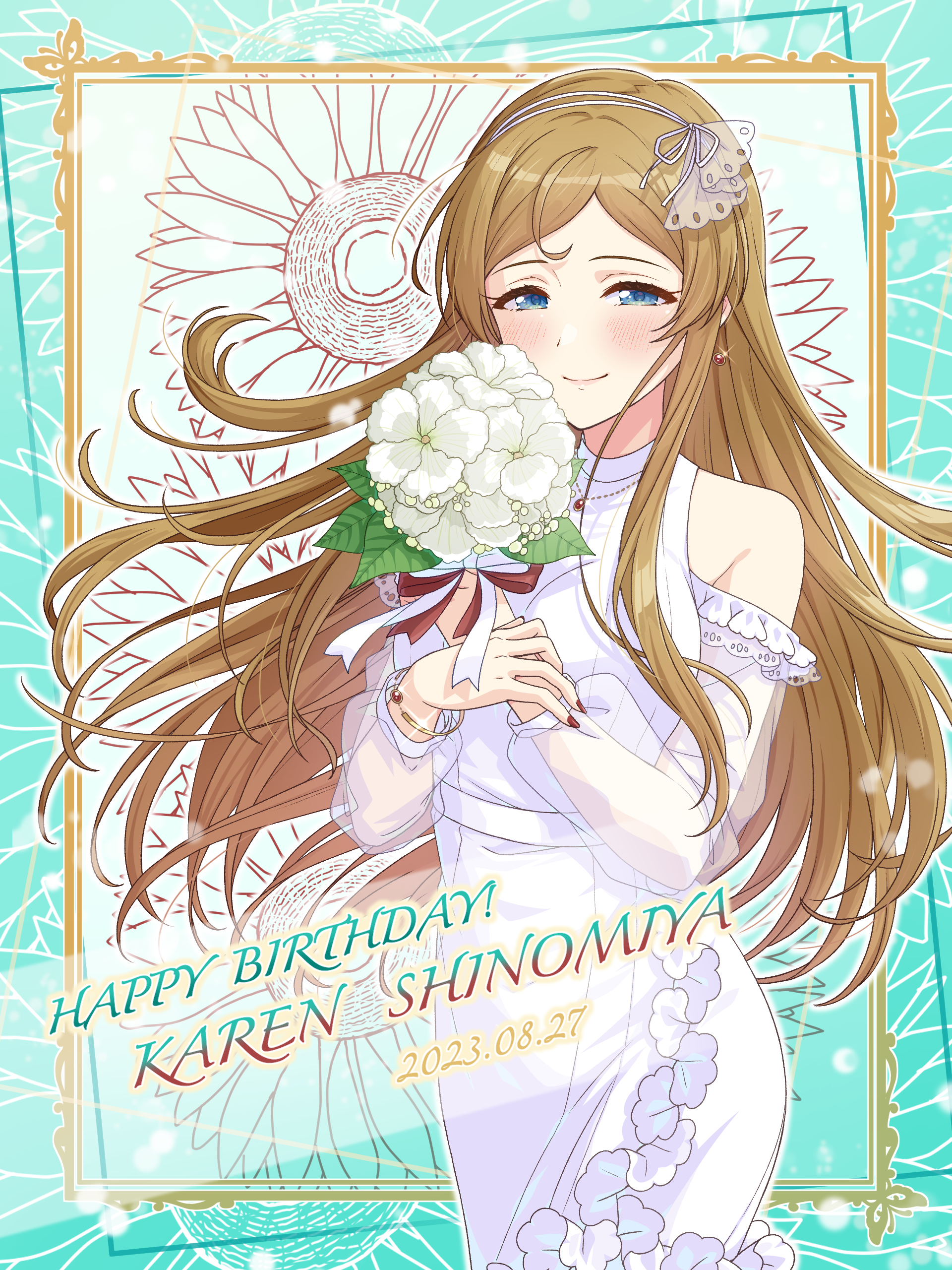 1girl 2023 absurdres ahoge bare_shoulders blue_eyes blush border bouquet bow bracelet breasts brown_hair character_name dress earrings flower framed frilled_dress frills hairband happy_birthday highres holding holding_bouquet idolmaster idolmaster_million_live! idolmaster_million_live!_theater_days jewelry long_hair long_sleeves looking_at_viewer applying_manicure medium_breasts moonflower_(flower) nail_polish ornate_border outside_border red_nails ribbon see-through_clothes see-through_sleeves shinomiya_karen shiro_(ongrokm) smile solo white_dress